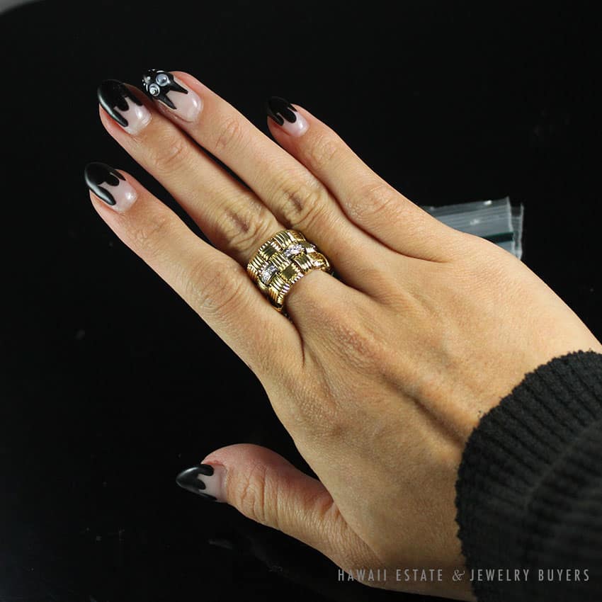– 18K Yellow Gold with 3 rows of woven style gold roaws. The row of diamonds is in 18K white gold.