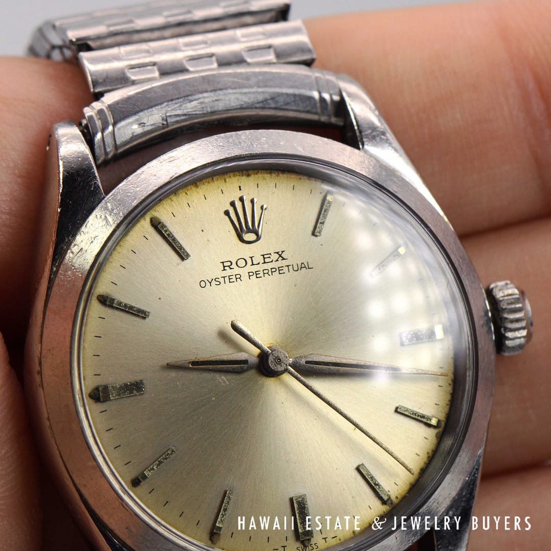 Vintage Rolex Oyster Perpetual wristwatch featuring a classic champagne dial, stainless steel case, and matching bracelet. Perfect for collectors or restoration.