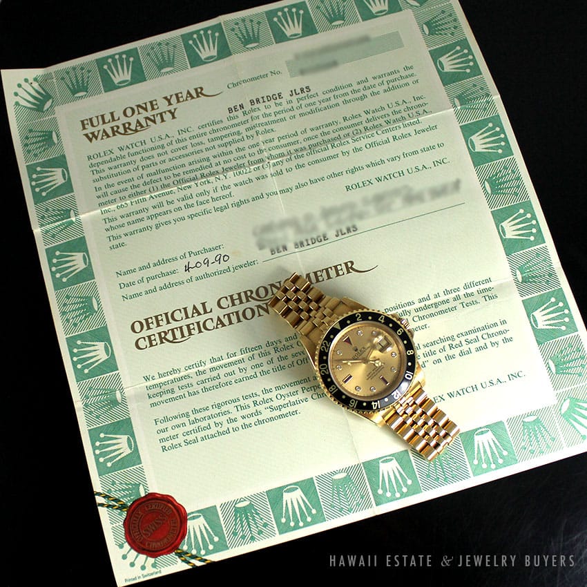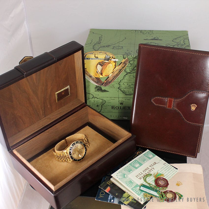 1984 Men's Rolex GMT-Master 18K Yellow Gold Serti Diamond Ruby Watch w/ Green Box, Papers, & Leather Notebook