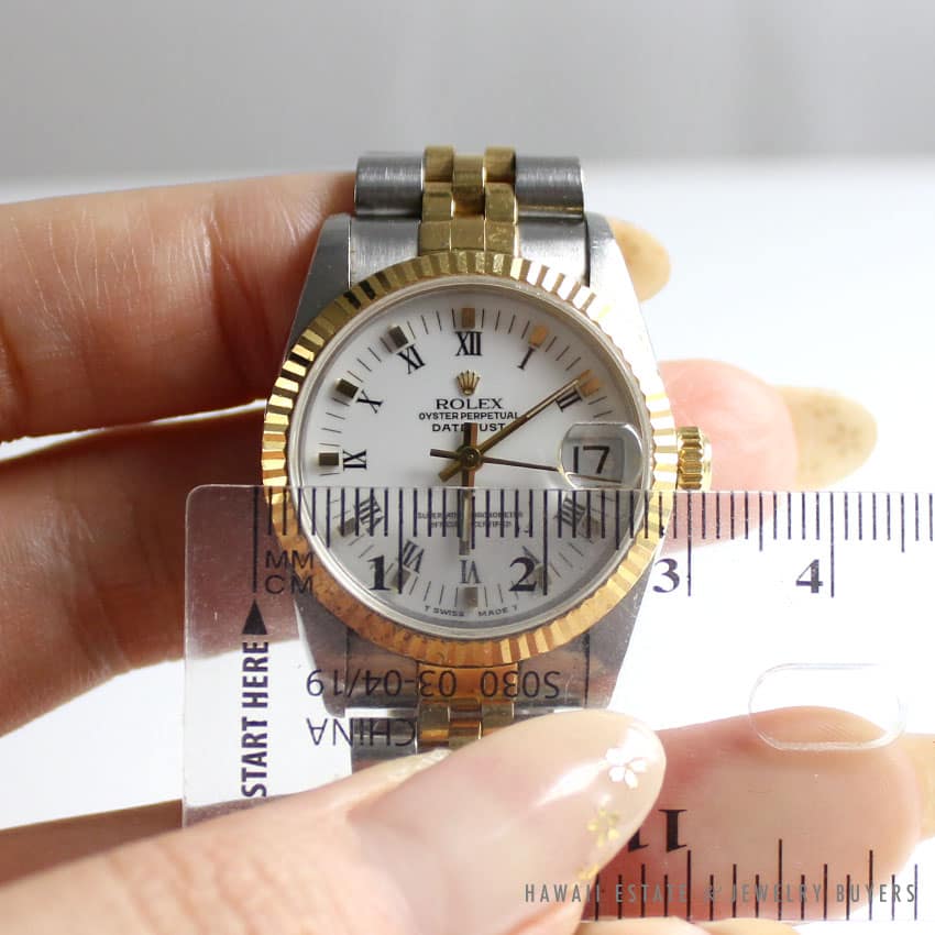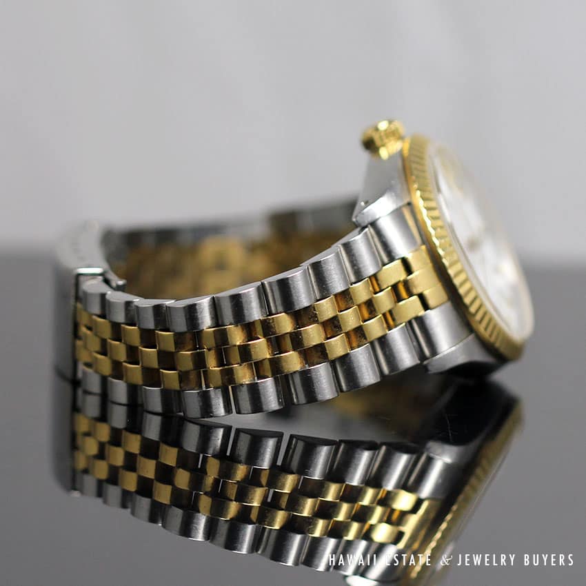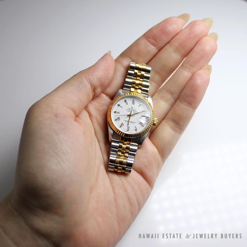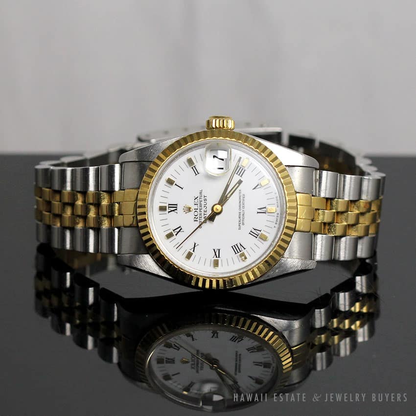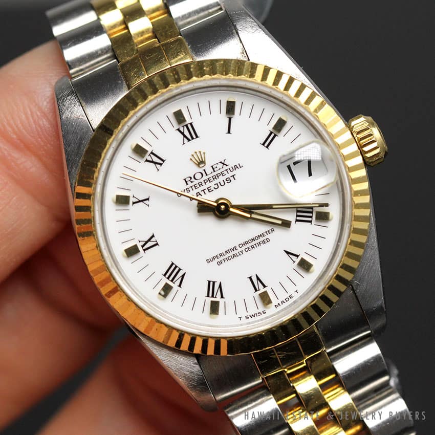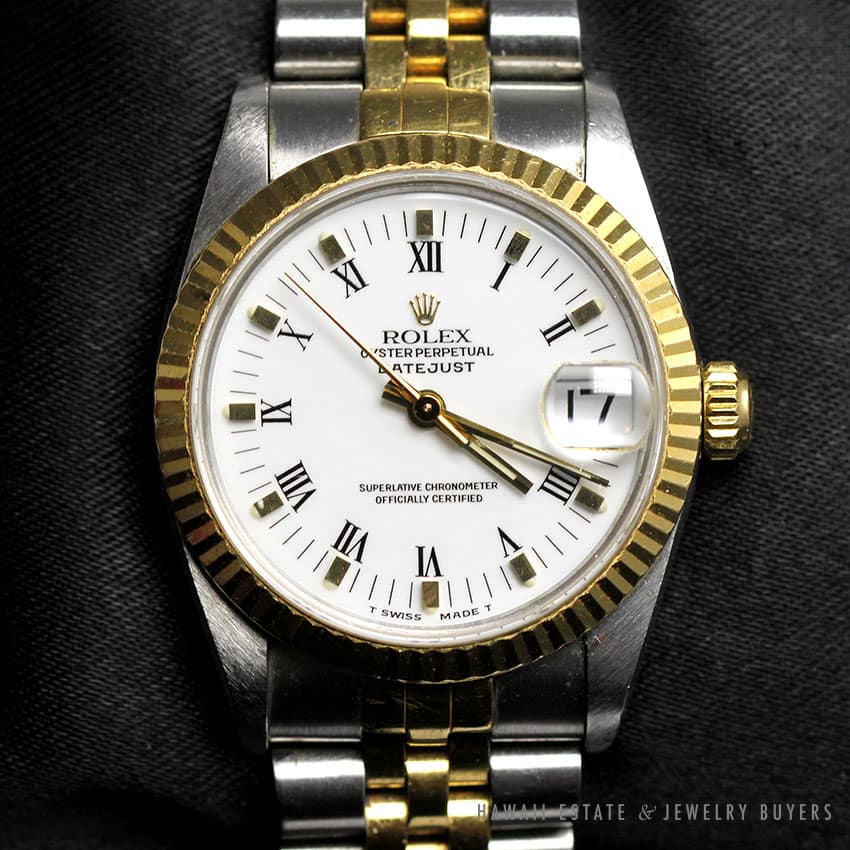 DescriptionWHITE WITH BLACK ROMAN NUMERAL MARKERSSTEEL & YELLOW GOLDSTYLE 68273SERIAL LXXXXXX (YEAR 1989)CASE 29MM LADIES SIZEFITS APPROX 6″ WRISTGREAT CONDITION!$4,500.00Out of stockSKU: 2411-02Category: Pre-owned Luxury WatchesTags: rolex, ROLEX LADIES, ROLEX LADIES DATEJUST, ROLEX LADIES DATEJUST WHITE, ROLEX WHITE DATEJUSTRelated StylesROLEX RARE VINTAGE BUBBLE BACK 14K YELLOW GOLD OYSTER PERPETUAL WATCH 5015 1945$11,000.00BLVGARI WATCH WITH HANDWRITTEN LETTER BY DORIS DUKE to LON BENTLEY W/ ENGRAVING$11,000.00ROLEX GMT-MASTER 18K YELLOW GOLD SERTI DIAMOND RUBY 16758 WATCH WITH BOX & PAPER$89,900.00RARE ROLEX SUBMARINER 1680 BLACK NIPPLE DIAL 18K YELLOW GOLD BRACELET WATCH$79,900.00