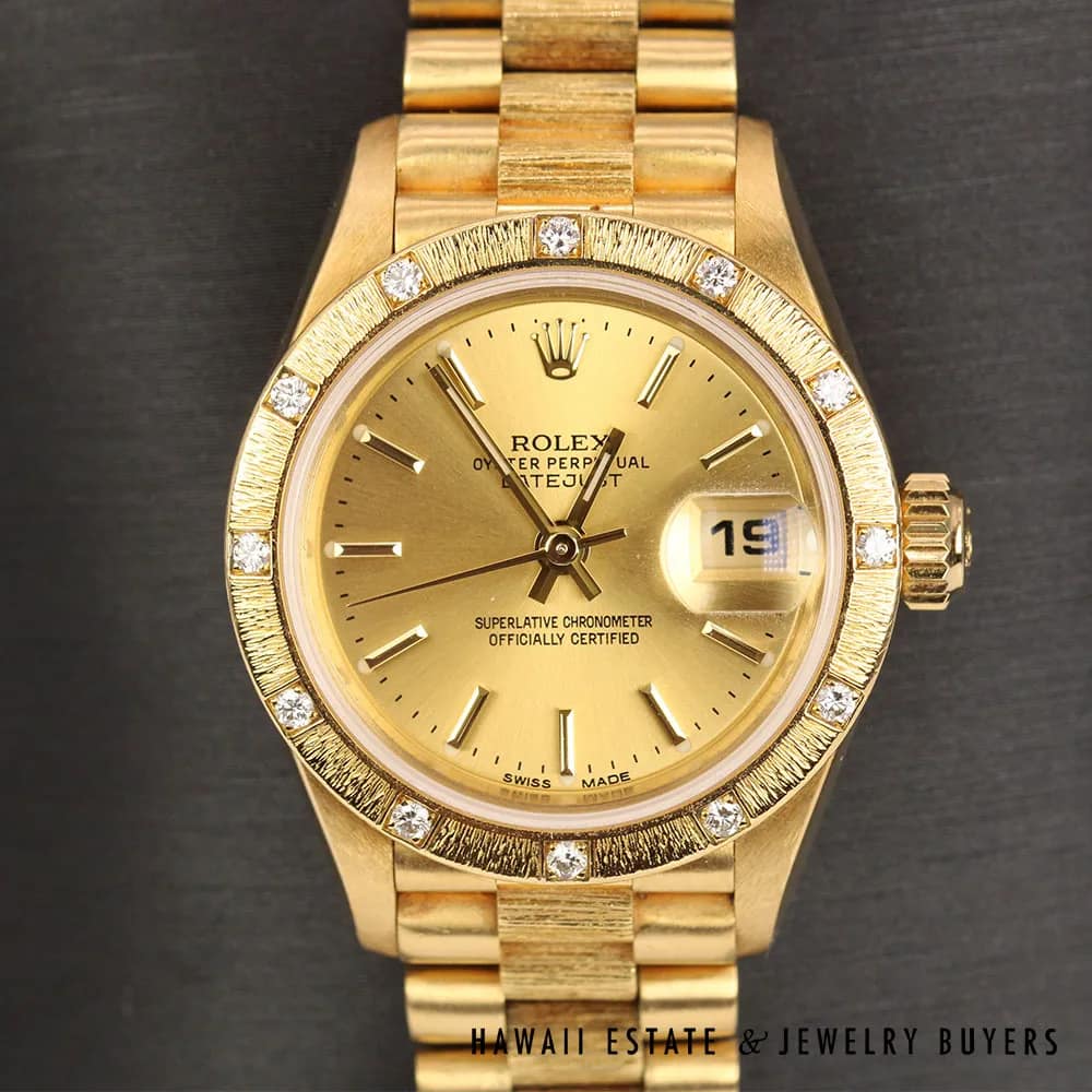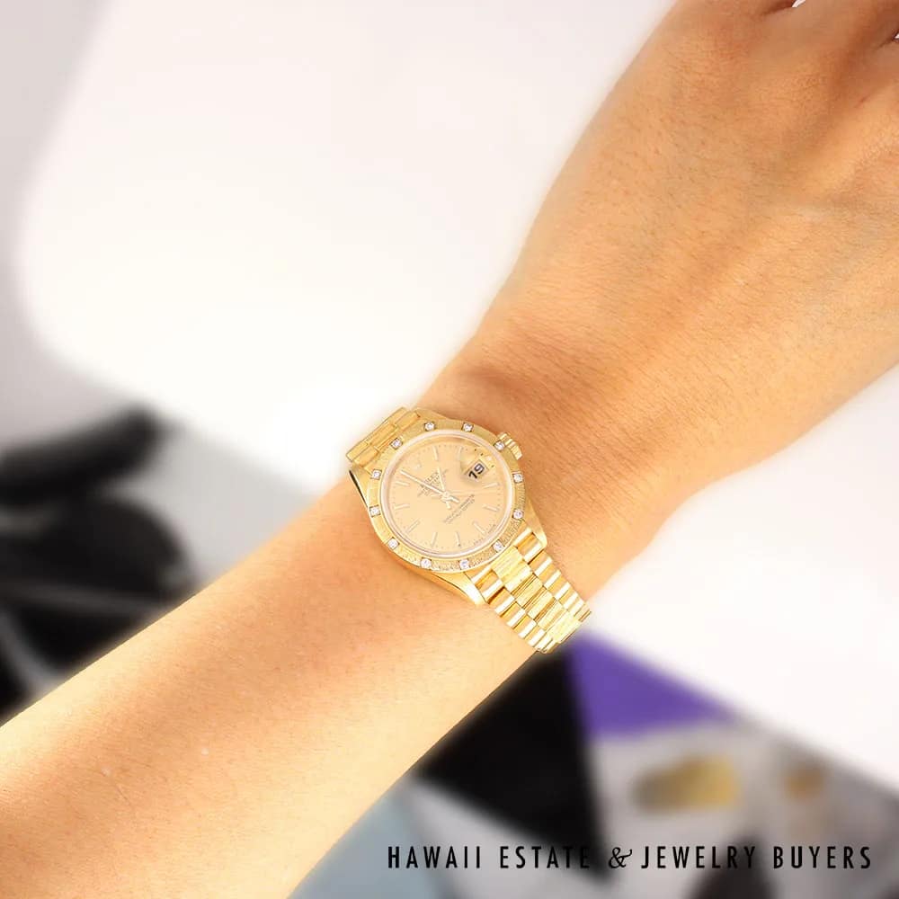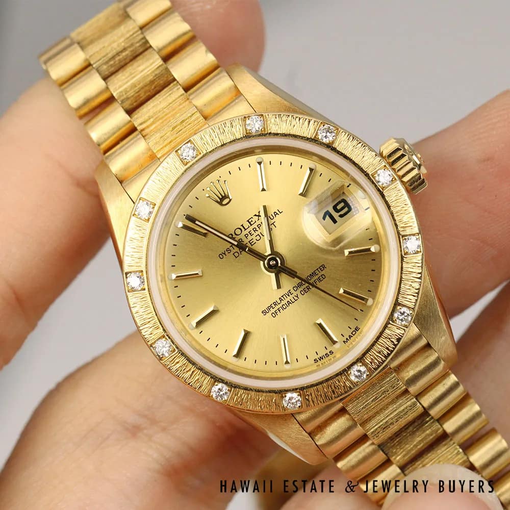 AUTHENTIC Working condition,18K yellow gold Rolex Lady-Datejust wristwatch, Serial Circa 1991, Ref 69288, with a stunning bark finish pyramid diamond bezel.