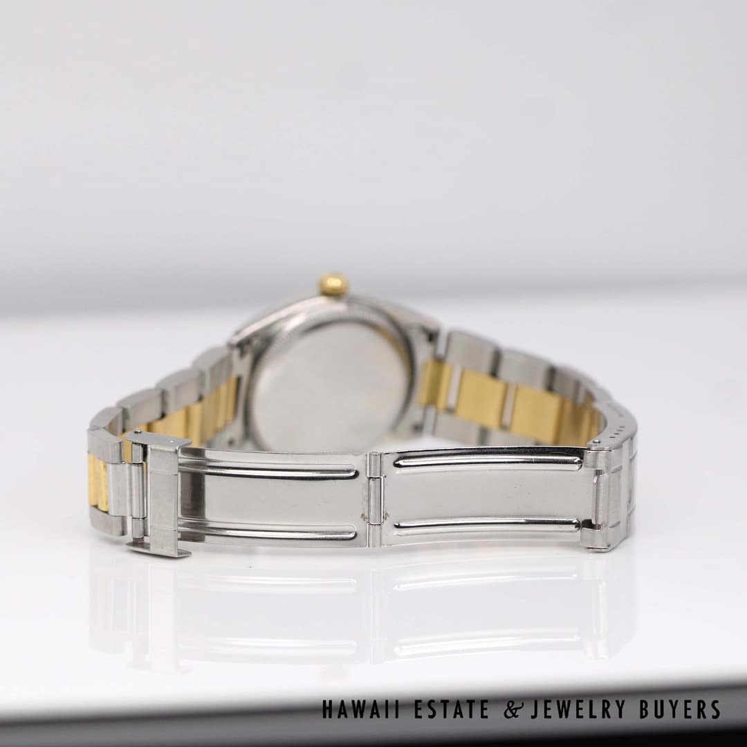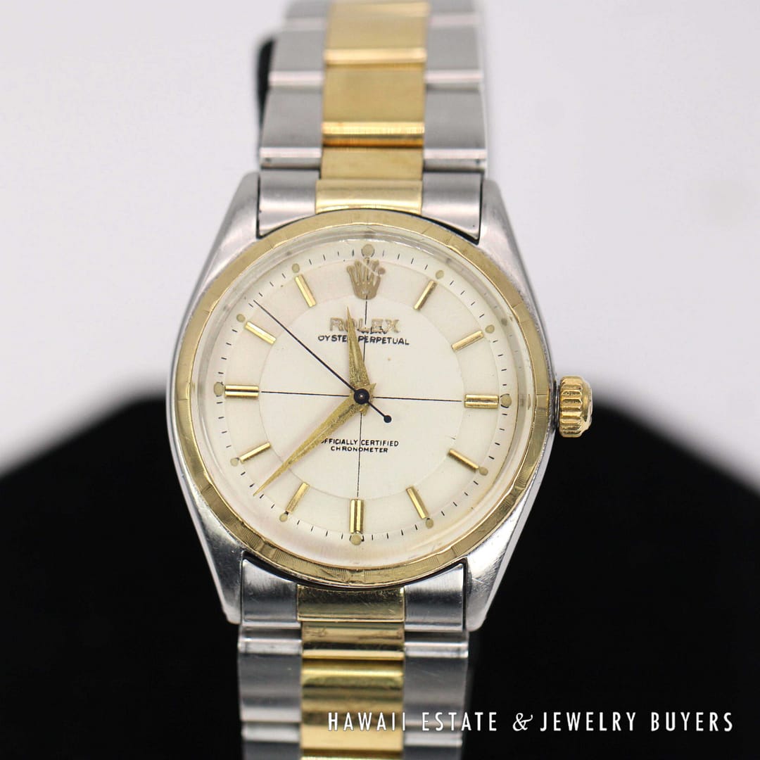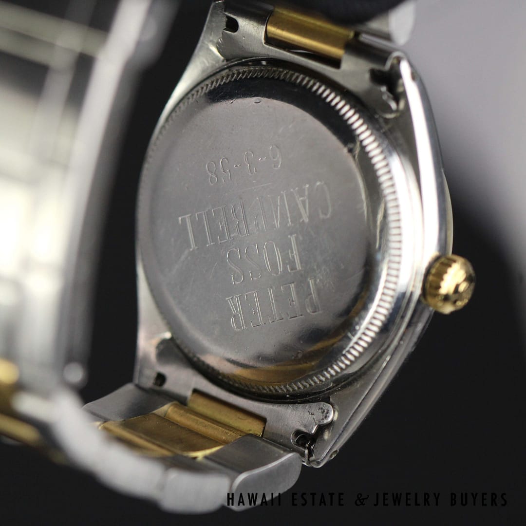 DescriptionNote: Band is a replacement and is NOT Rolex.Case has an engraving on the back as shown. ROLEX OYSTER PERPETUAL TWO TONE 33MM REF 6565 CIRCA 1958 (PC050621-63)$3,500.001 in stockRolex Oyster Perpetual Two Tone 33mm Ref. 6565, circa 1958 quantityAdd to cartMake OfferSKU: PC050621-63Category: Pre-owned Luxury WatchesRelated Styles1930’s ANTIQUE ART DECO DIAMOND BAGUETTE WRIST WATCH WORKING CONDITION$3,692.00RARE ROLEX SUBMARINER 1680 BLACK NIPPLE DIAL 18K YELLOW GOLD BRACELET WATCH$79,900.00LADIES BLANCPAIN VILLERET 28MM 18K ALLIGATOR MECHANICAL SWISS WATCH w/ APPRAISAL$3,800.00HISTORIC ROLEX DIAMOND DIAL DAY-DATE PRESIDENTIAL 36mm WATCH W/ APPRAISAL$30,000.00