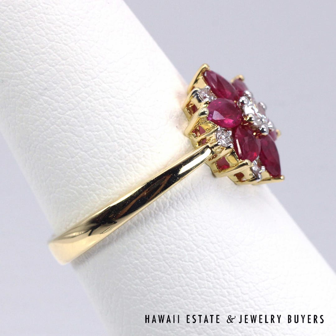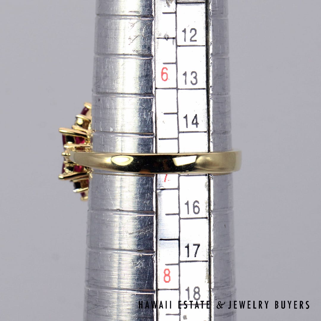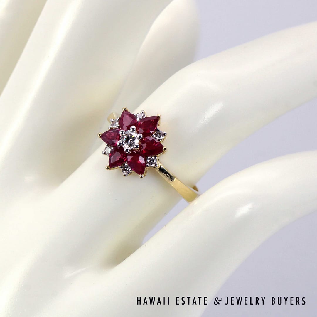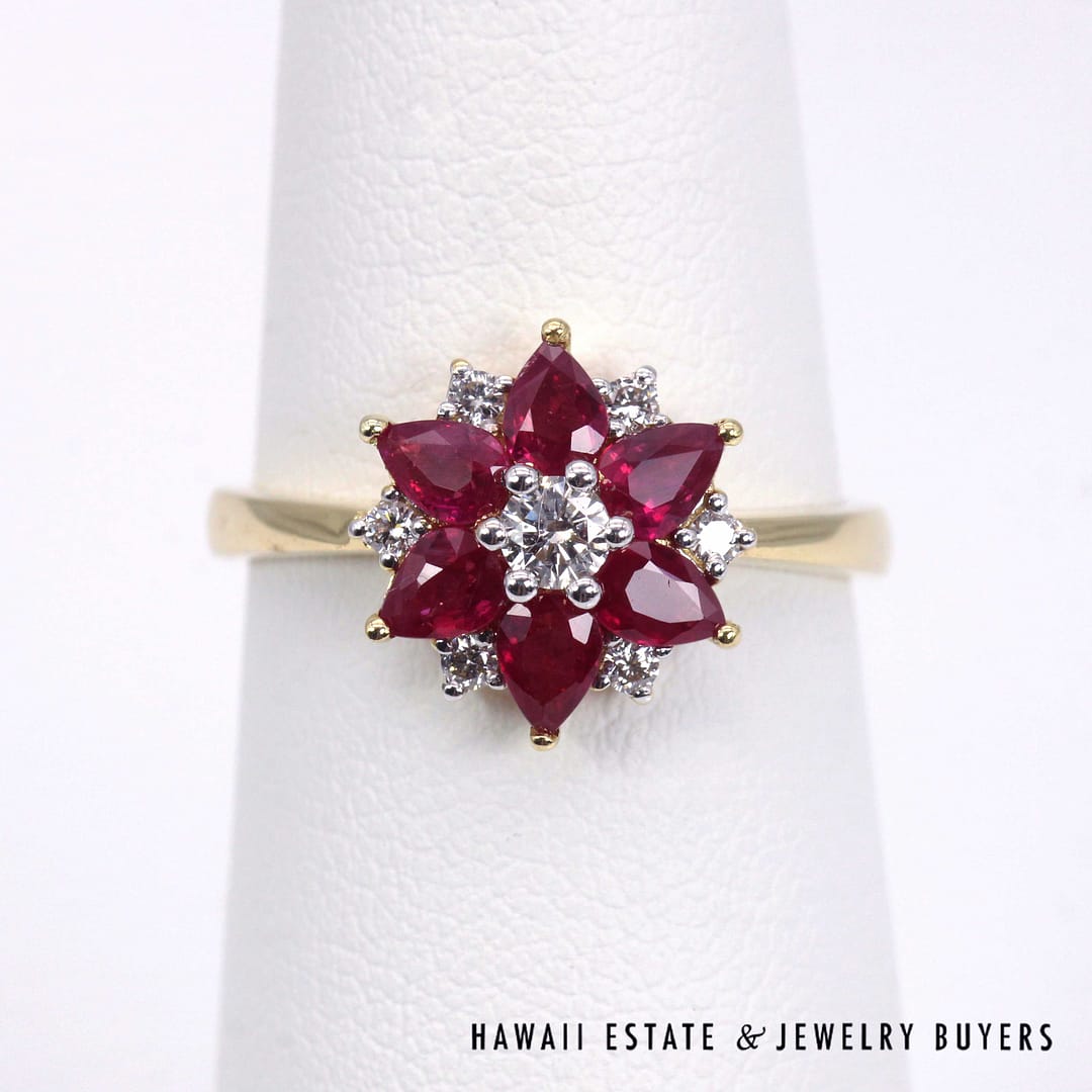 DescriptionBeautiful 14K yellow gold floral cluster ring featuring vivid pear-shaped rubies accented by sparkling round diamonds.3g 18KYG 1ctw RUBY 0.12ctw DIAMOND RING SIZE 7 (3119-01)$1,200.001 in stockRuby & Diamond Star Flower 18K Yellow Gold Dainty Ring Size 7 quantityAdd to cartMake OfferSKU: 3119-01Category: Pre-owned Gemstone JewelryRelated StylesVintage Coral 14K Yellow Gold Saddle Ring Size 8$900.0010ctw PINK SAPPHIRE CABOCHON TREE OF LIFE 19.3g 14K YELLOW GOLD PENDANT BROOCH$3,242.40Black Coral 24K Yellow Gold Hinged Bangle Bracelet Size 6.25$5,600.0011.3g 18KWG 6ct Amethyst 0.08ct Diamond Pendant on 14KWG 18′ 1.5mm Rope Chain$1,750.00