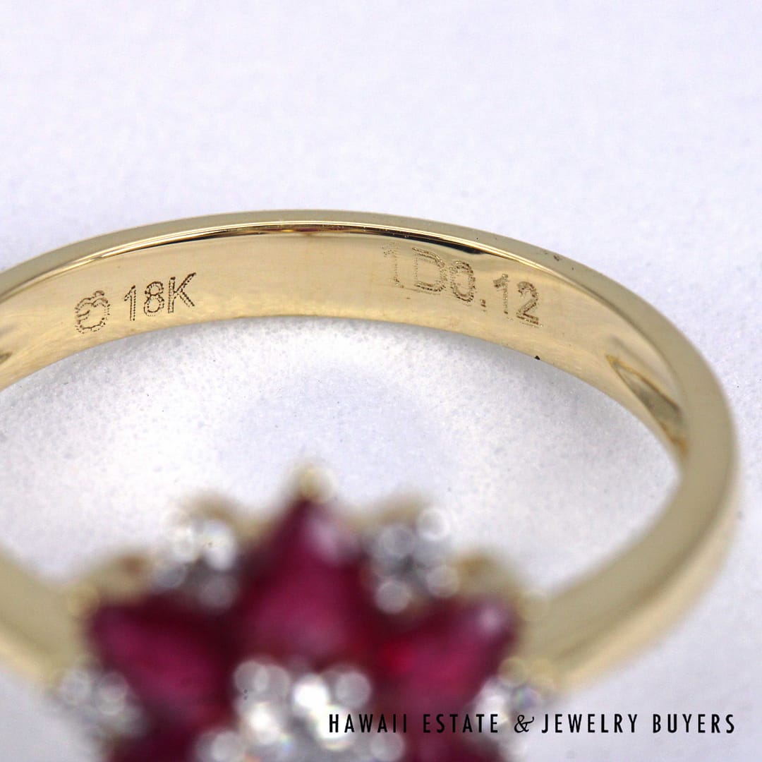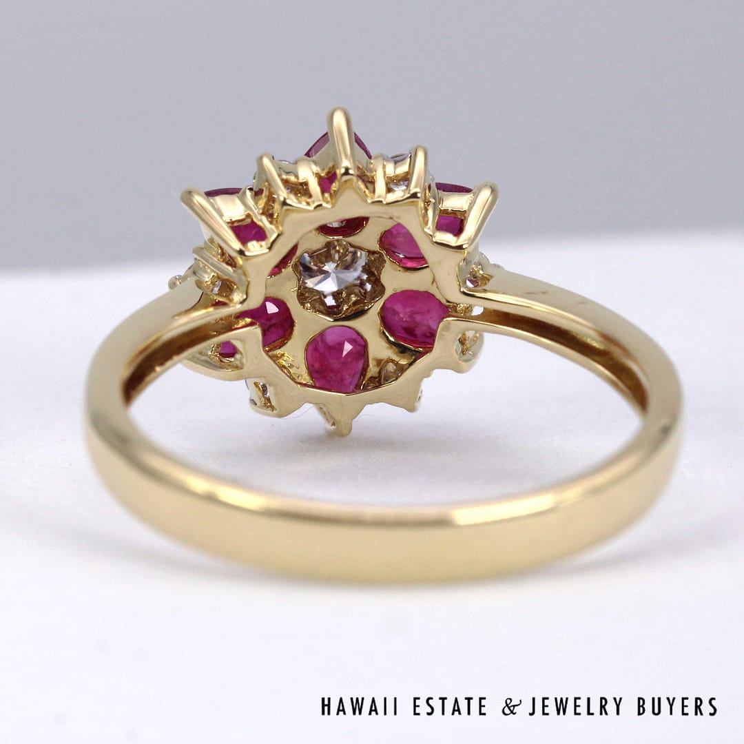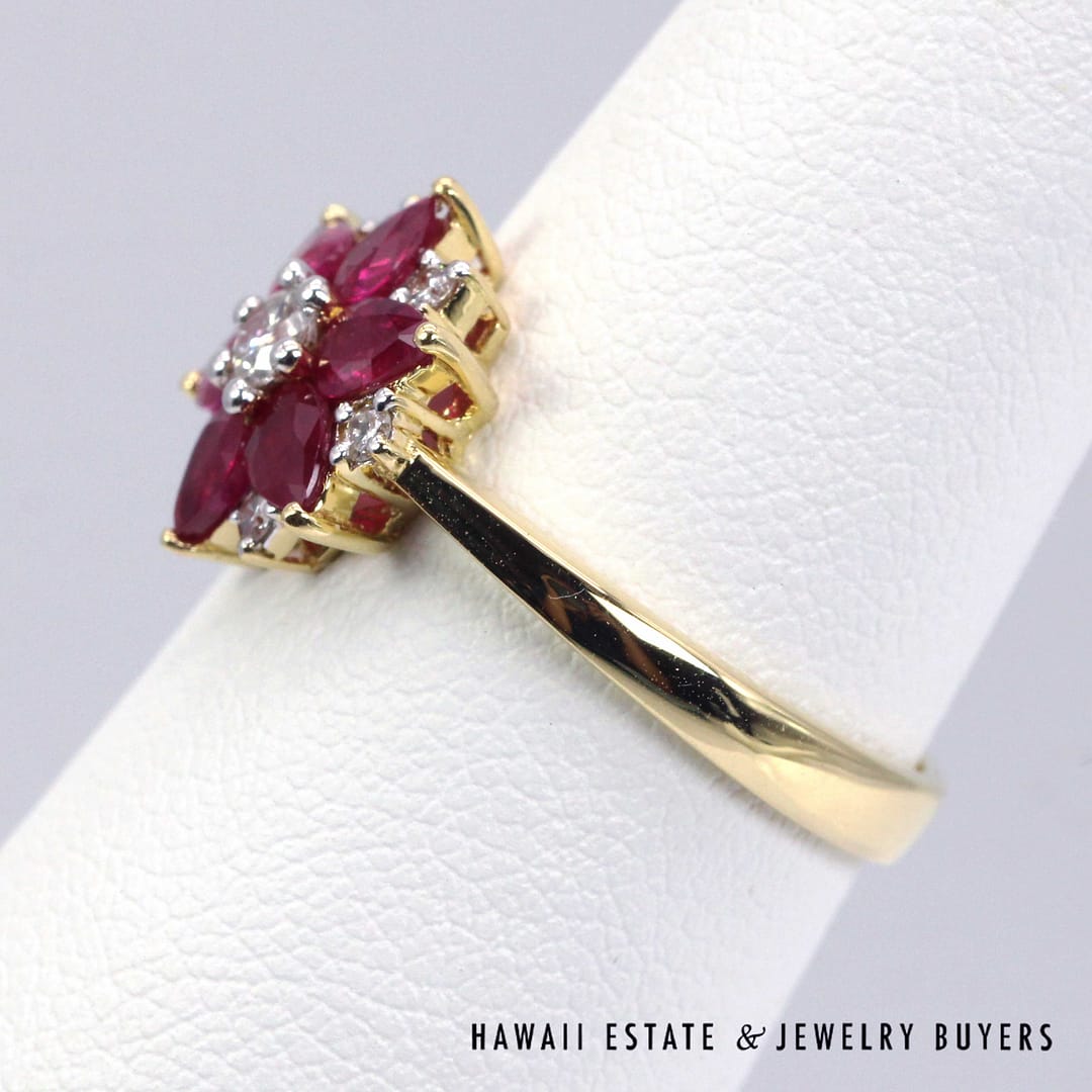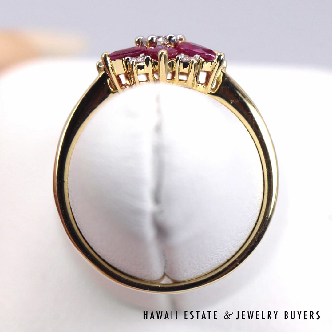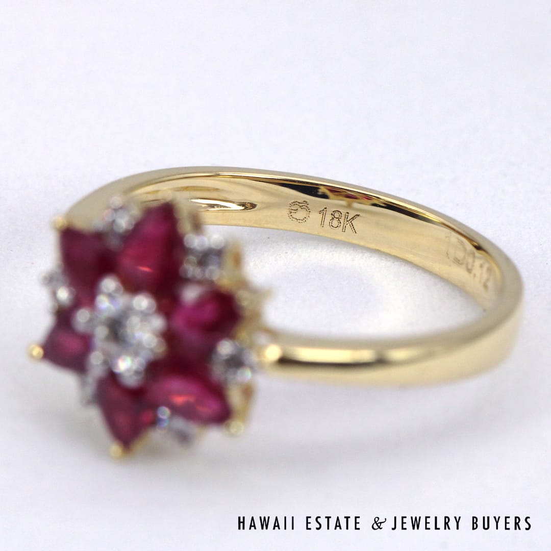 DescriptionBeautiful 14K yellow gold floral cluster ring featuring vivid pear-shaped rubies accented by sparkling round diamonds.3g 18KYG 1ctw RUBY 0.12ctw DIAMOND RING SIZE 7 (3119-01)$1,200.001 in stockRuby & Diamond Star Flower 18K Yellow Gold Dainty Ring Size 7 quantityAdd to cartMake OfferSKU: 3119-01Category: Pre-owned Gemstone JewelryRelated StylesVintage Coral 14K Yellow Gold Saddle Ring Size 8$900.0010ctw PINK SAPPHIRE CABOCHON TREE OF LIFE 19.3g 14K YELLOW GOLD PENDANT BROOCH$3,242.40Black Coral 24K Yellow Gold Hinged Bangle Bracelet Size 6.25$5,600.0011.3g 18KWG 6ct Amethyst 0.08ct Diamond Pendant on 14KWG 18′ 1.5mm Rope Chain$1,750.00