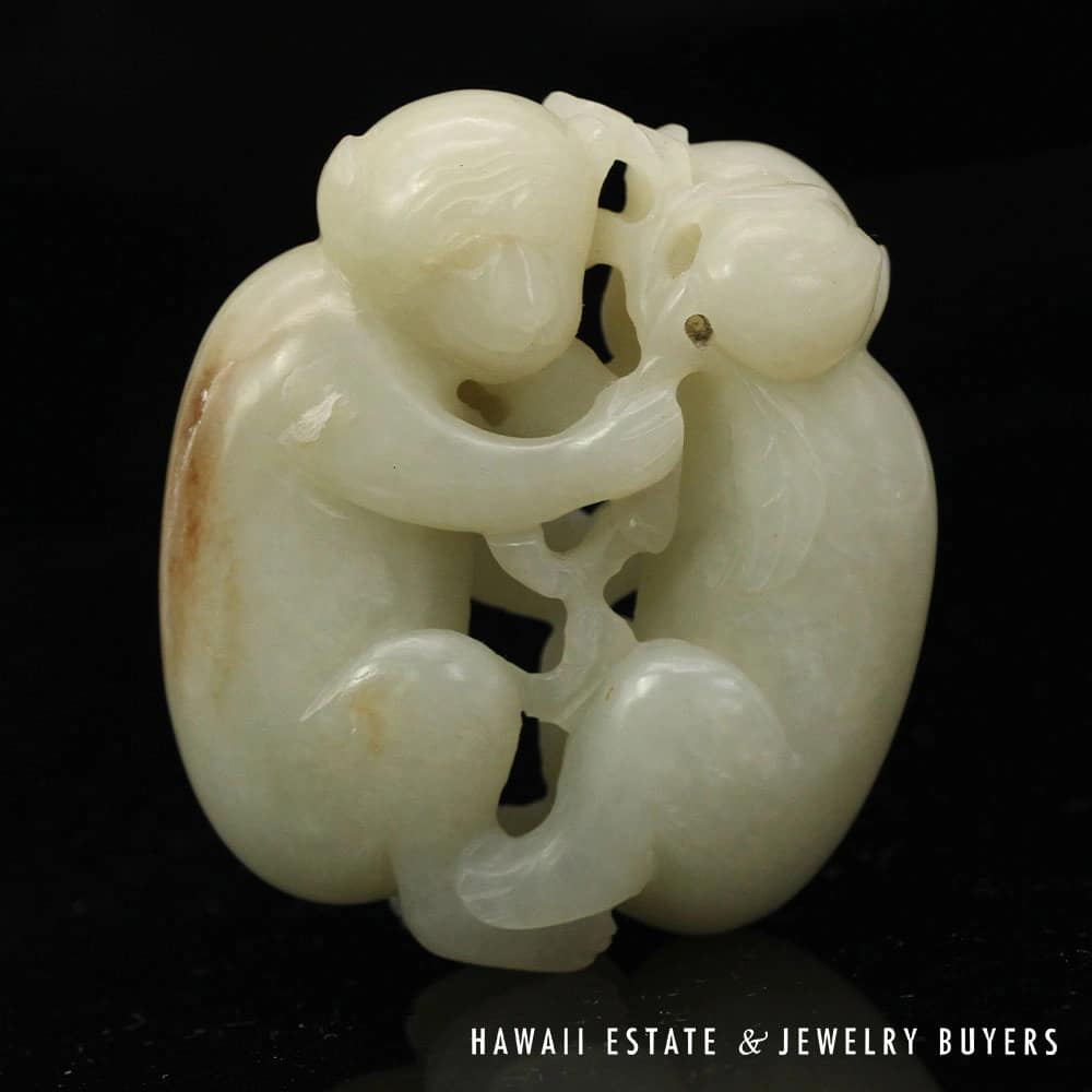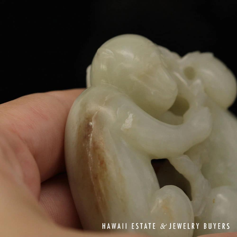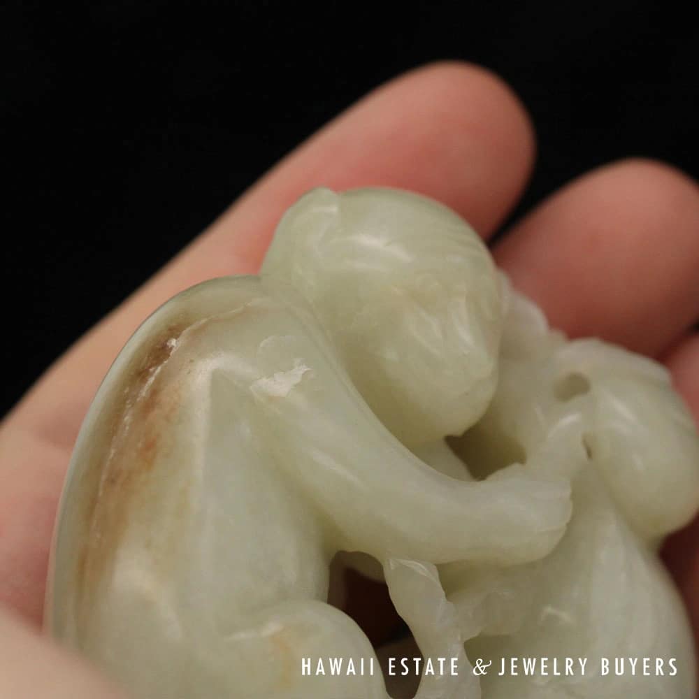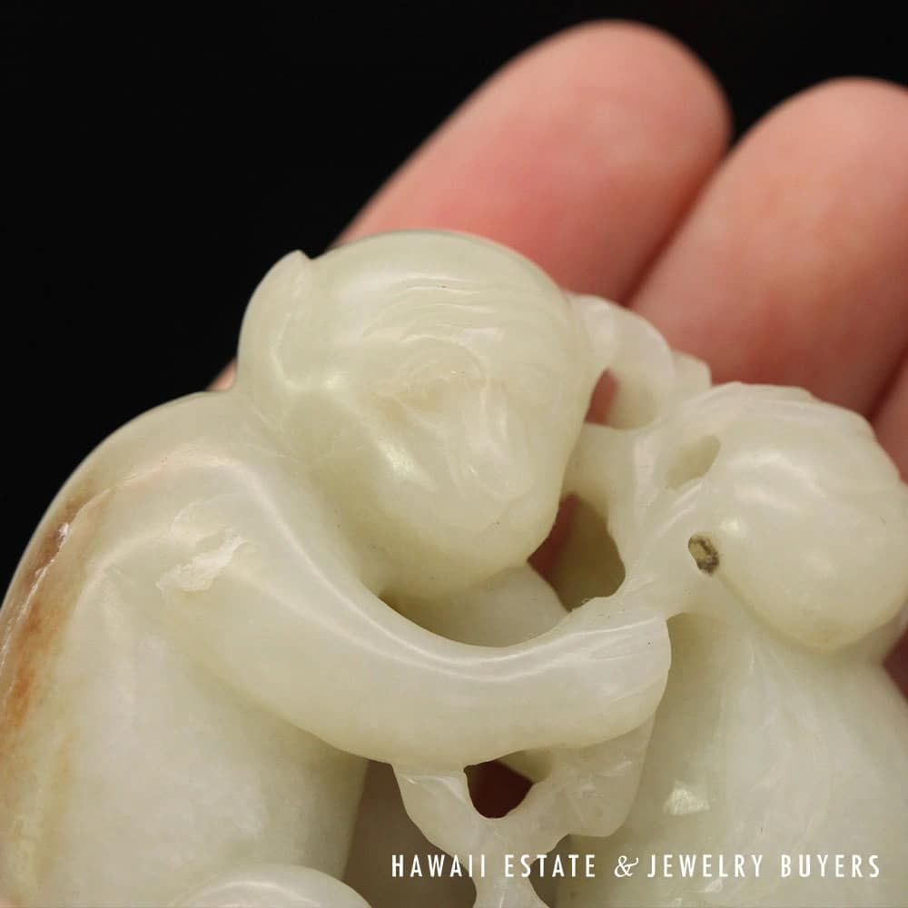 Delve into the elegance of Chinese artistry with this Antique Qing Dynasty Mutton Fat Jade Carving, featuring an endearing pair of monkeys. Crafted with meticulous detail, the jade’s natural translucence and texture provide a serene visual appeal. It’s an exquisite find for collectors and connoisseurs alike, offering a touch of historical sophistication and a whisper of the esteemed Qing Dynasty’s craftsmanship.