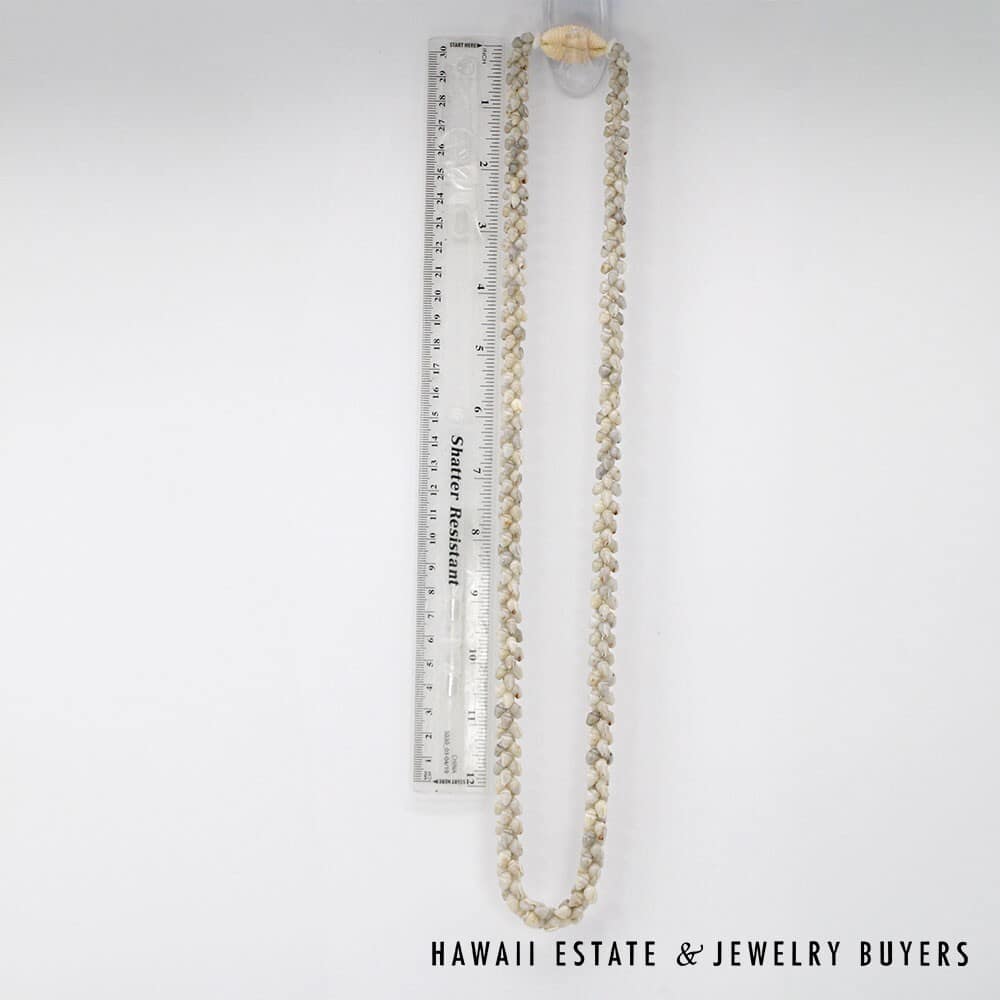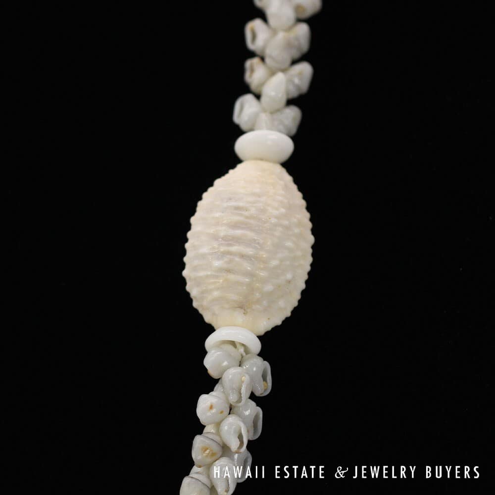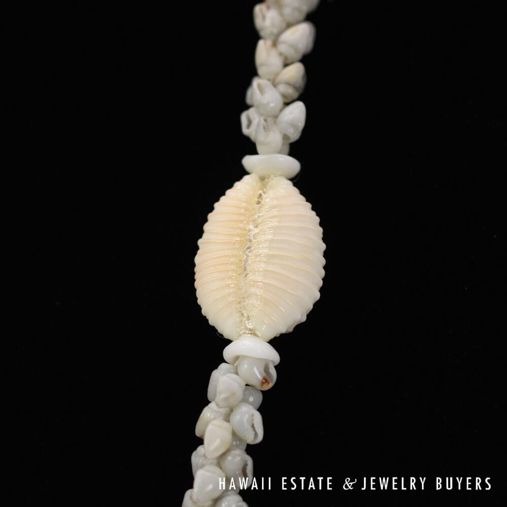 All shells are of the Momi (Dove shell) variety with Uli'Uli (a rare, medium/dark gray) coloring. The strands are connected by a 18mmX26mm Pōleholeho (decorative shell which ties the ends of each strand together) of the 'Āpu'upu'u (bumpy cowrie) variety.