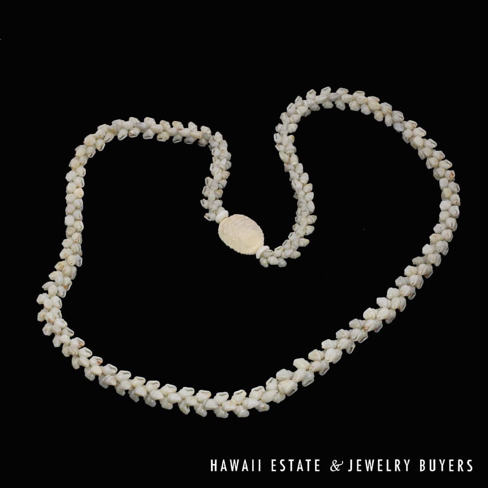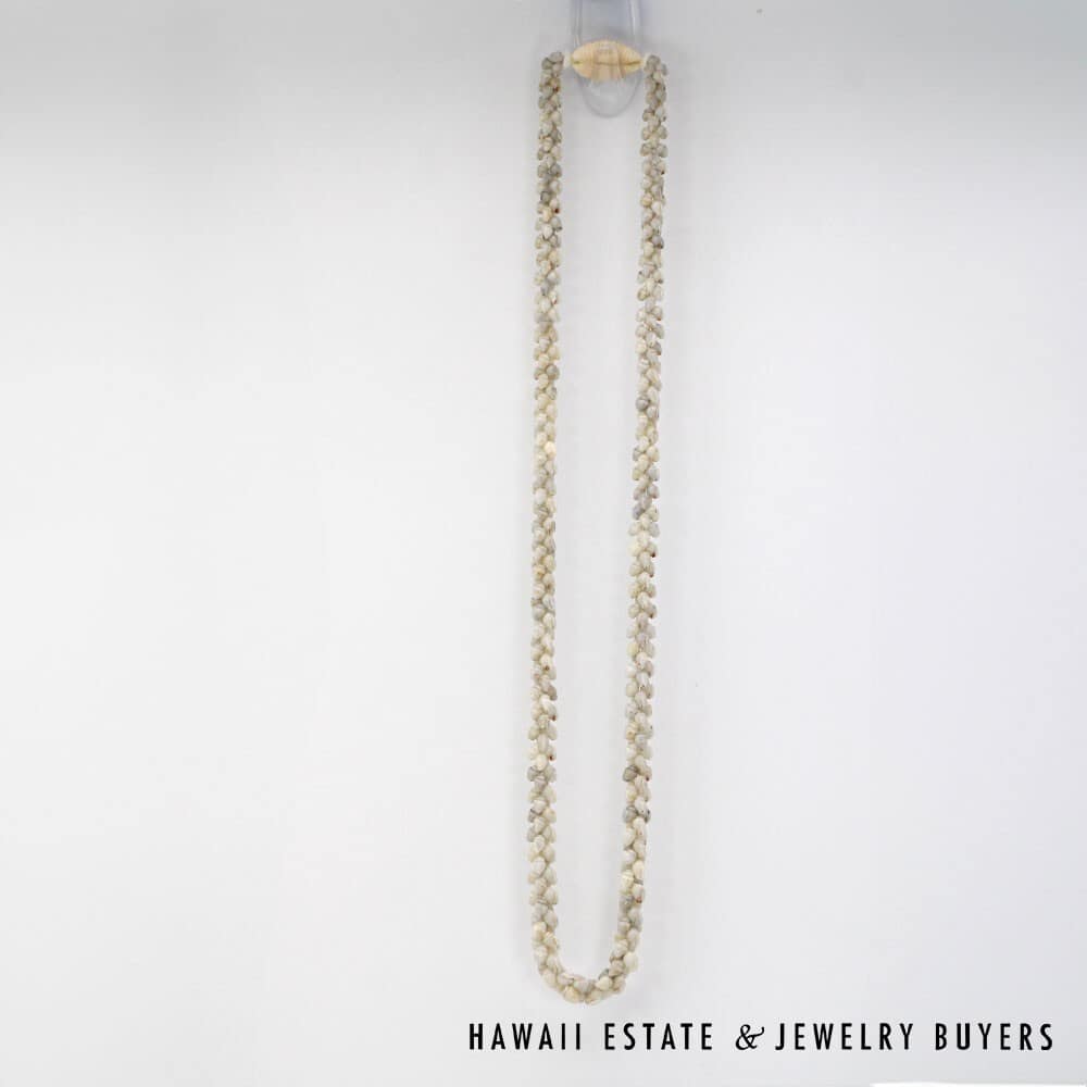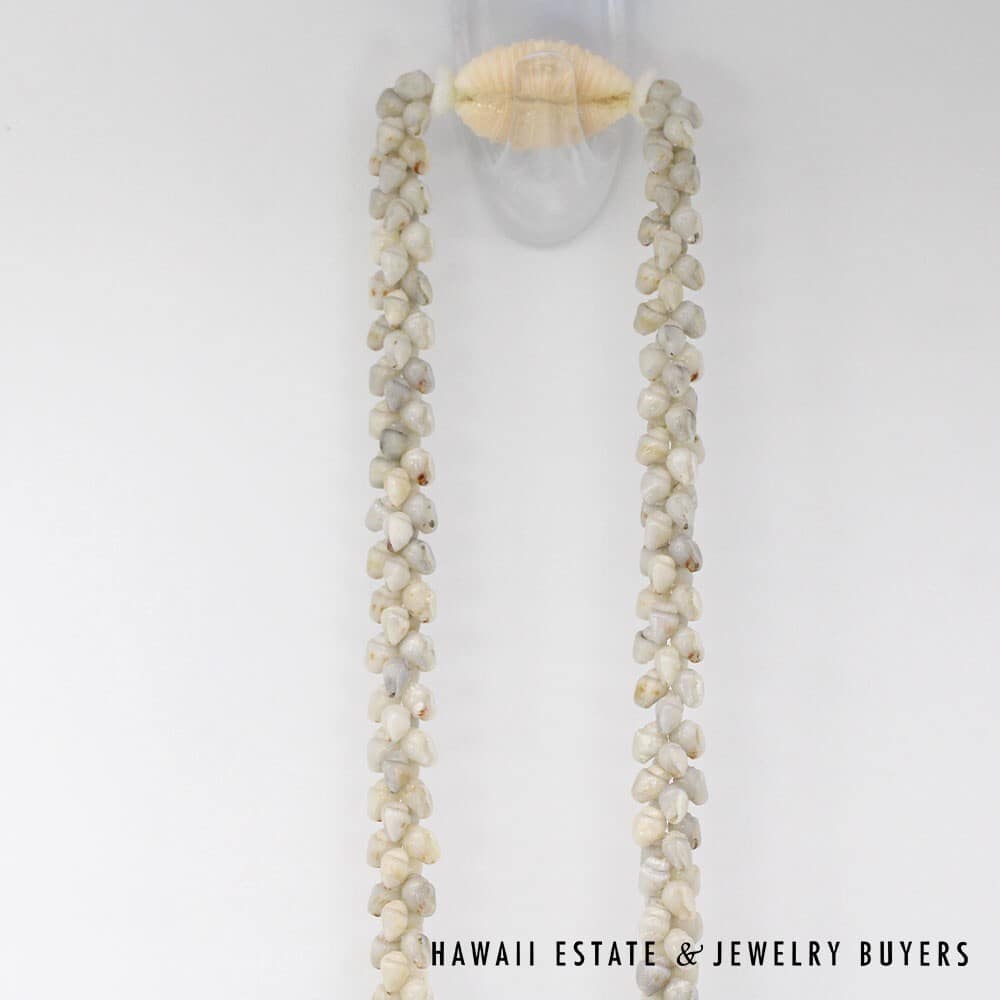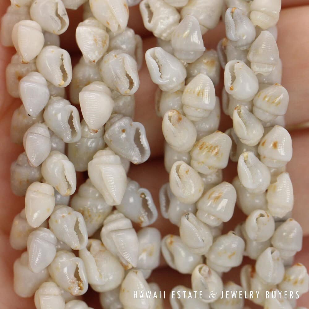 All shells are of the Momi (Dove shell) variety with Uli'Uli (a rare, medium/dark gray) coloring. The strands are connected by a 18mmX26mm Pōleholeho (decorative shell which ties the ends of each strand together) of the 'Āpu'upu'u (bumpy cowrie) variety.