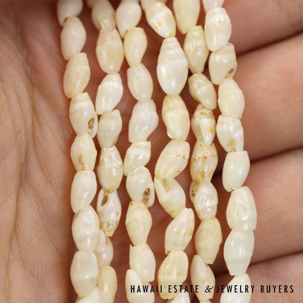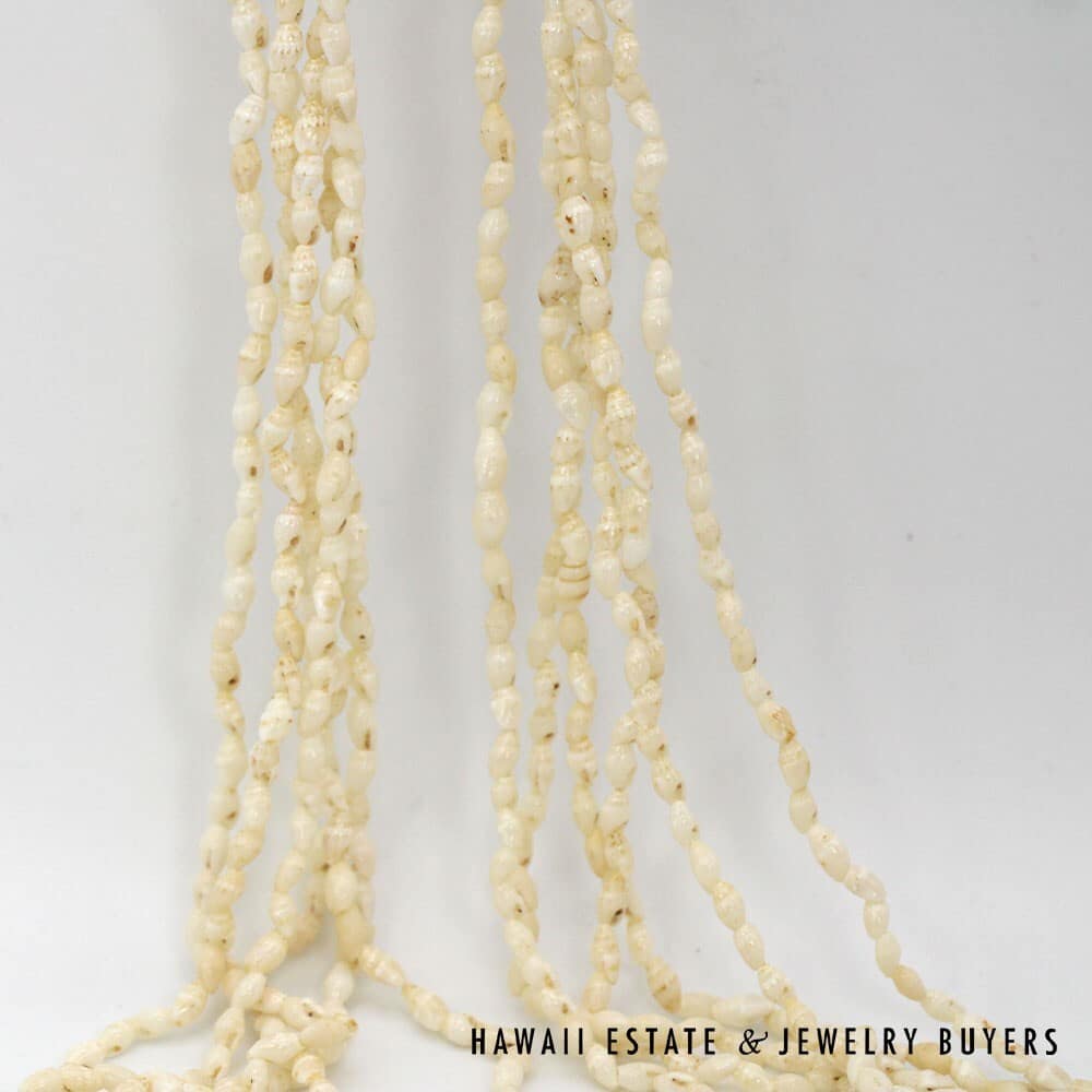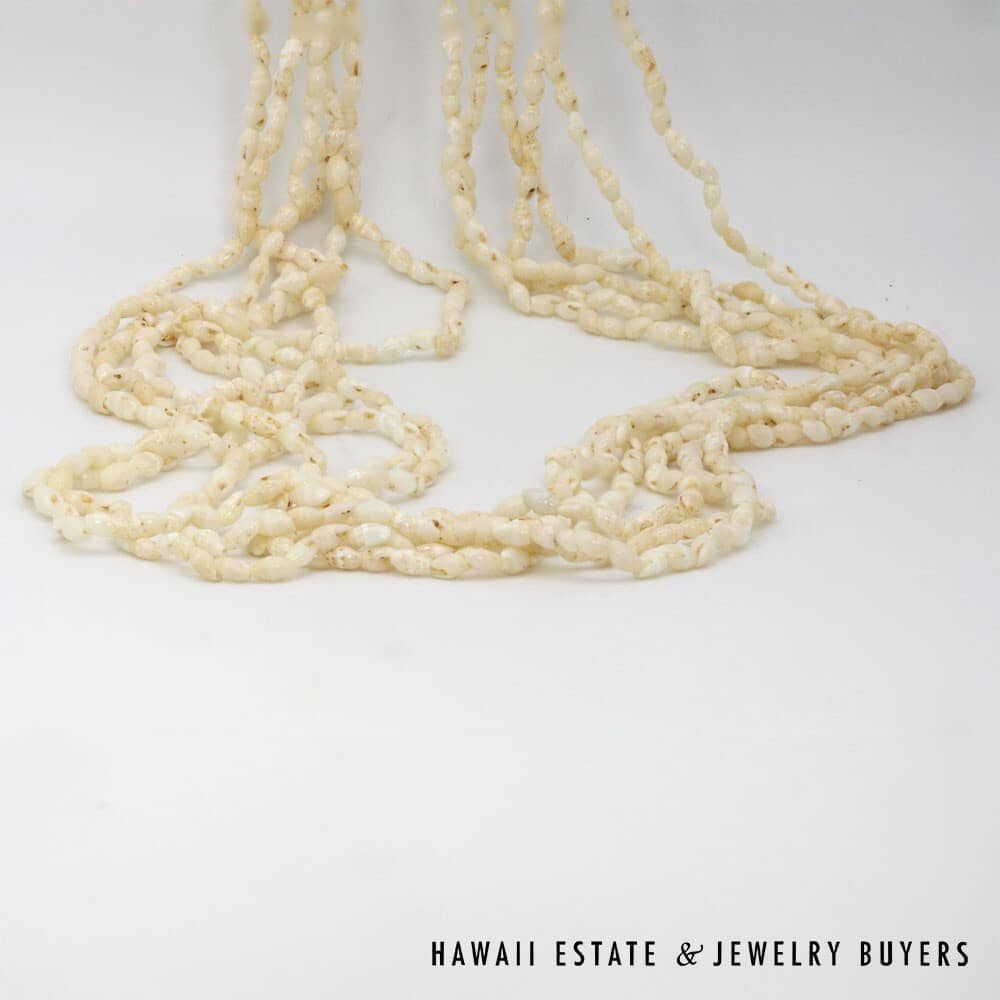 This piece features ten strands of Laiki (rice shells) strung together in the Pololei (stacked end-to-end) style. The shells have a warm Lenalena (white/off-white) coloration and are connected by a Pōlehole Apu'upu'u (bumpy cowry shell) that measures approximately 22mm long by 17mm wide.
