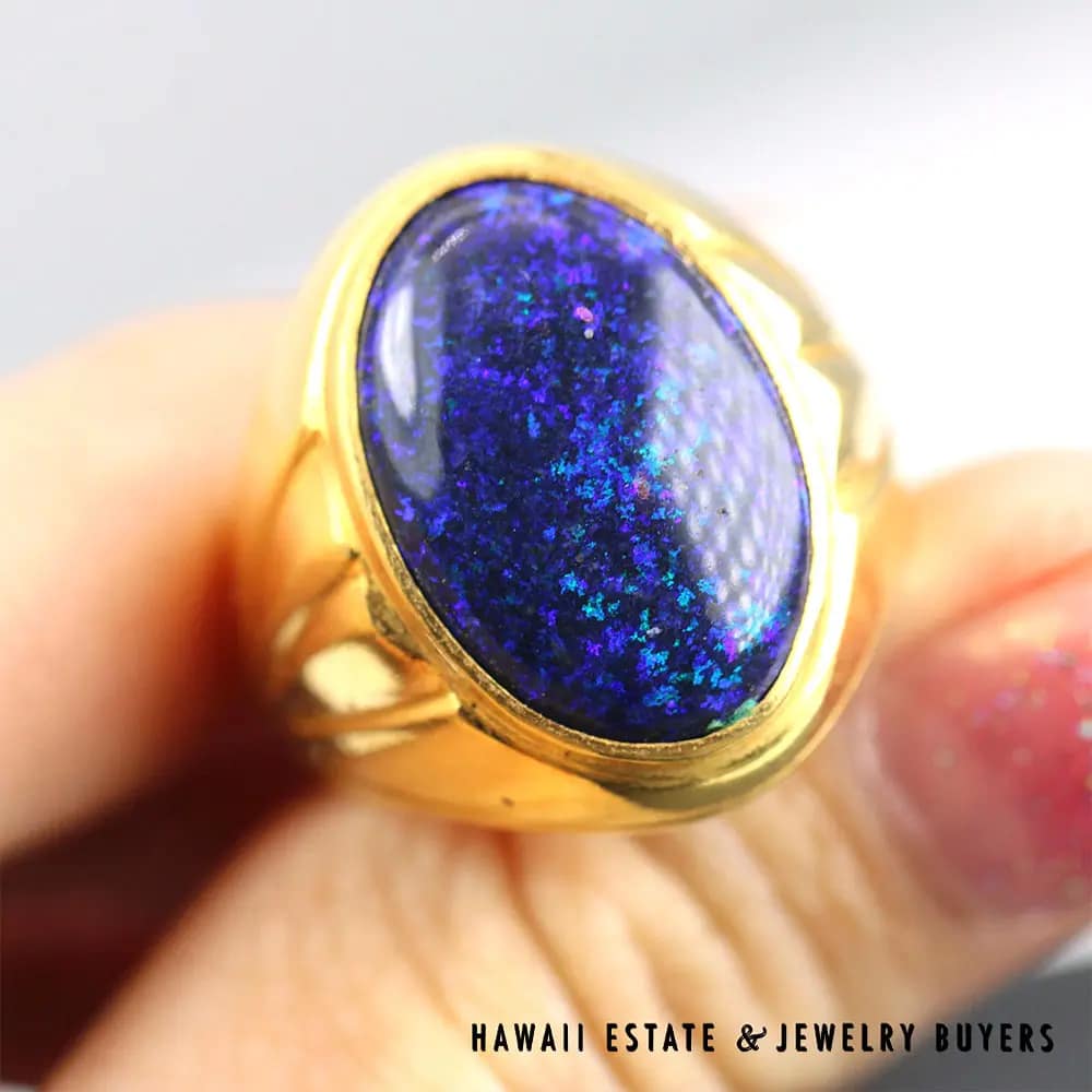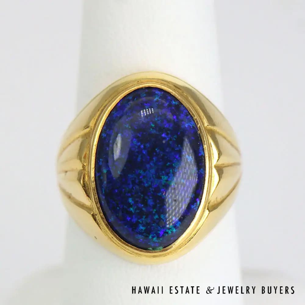 DescriptionDazzling Smoked Opal set in 22K Yellow Gold Gents Ring Size 8. Eye-catching piece!Sugar treated suspected.13.4g 22KYG SMOKED OPAL 18x12mm OVAL CAB GENTS RING SIZE 8 (3021-14)$2,000.001 in stockSmoked Blue Opal 22K Yellow Gold Gents Ring Size 8 quantityAdd to cartMake OfferSKU: 3021-14Category: Pre-owned Gemstone JewelryRelated StylesGIA 14.1g 14KWG 24.28ct AQUAMARINE AND 1ctw DIAMOND RING SIZE 7.5$11,000.0018.5ct Star Sapphire 20K Yellow Gold Cab Ring Size 6.5$1,900.0010ctw PINK SAPPHIRE CABOCHON TREE OF LIFE 19.3g 14K YELLOW GOLD PENDANT BROOCH$3,242.40Tiffany & Co. Garnet 18K Yellow Gold Sterling Silver Floral Brooch Pin$950.00