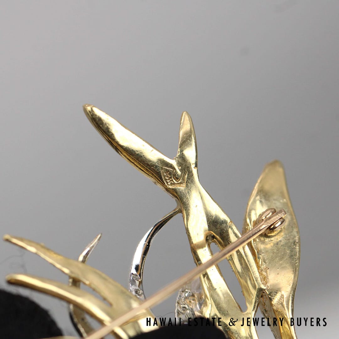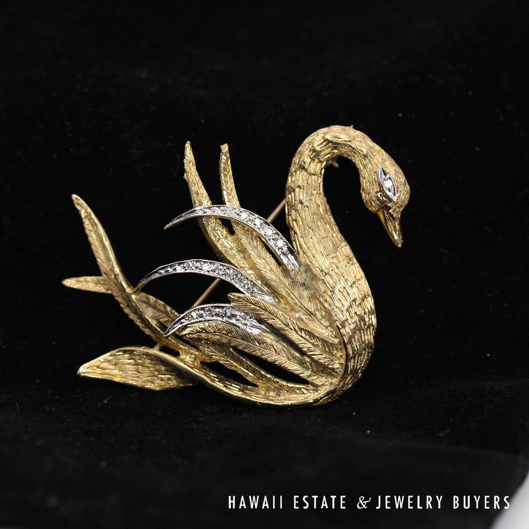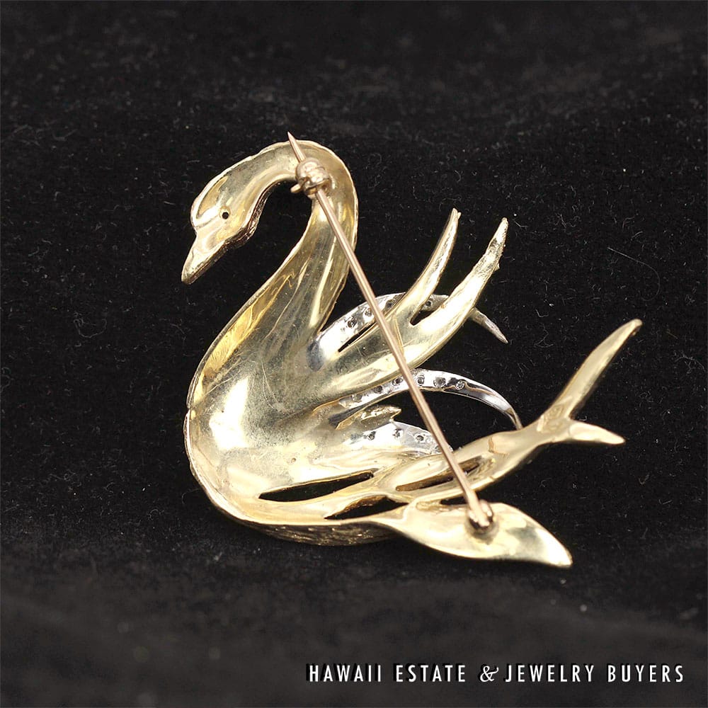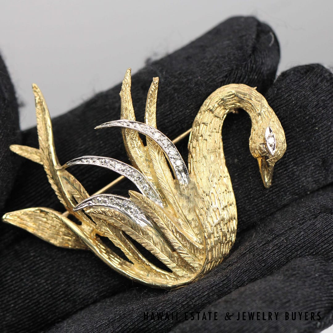 DescriptionA timeless piece crafted from luxurious 14K yellow gold. The Swan Diamond Brooch is an exquisite choice that symbolizes style and grace.13g 14KYG SWAN 0.08ctw DIAMOND BROOCH ( 2801-02)$2,000.001 in stockSwan 0.08ctw Diamond 14K Yellow Gold Brooch quantityAdd to cartMake OfferSKU: 2801-02Category: Pre-owned Diamond JewelryRelated StylesDIAMOND PAVE ROSE GOLD WHITE GOLD 18K FLOATING FLOWER RING SIZE 4.75$1,800.00.91CT ROUND DIAMOND BLUE NILE PLATINUM ENGAGEMENT .29CTW PRINCESS CUT SETTING RING (SIZE 4)$4,500.004.02ct Princess Cut Diamond Ring GIA H, VS1$75,000.001.50CTW PRINCESS CUT 14K YELLOW GOLD MEN’S RING SIZE 8.25$2,500.00