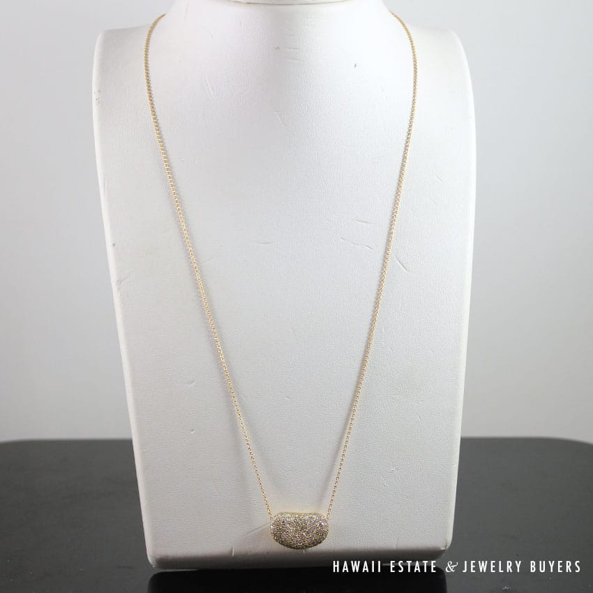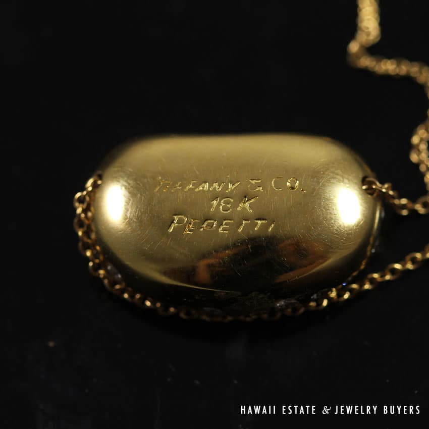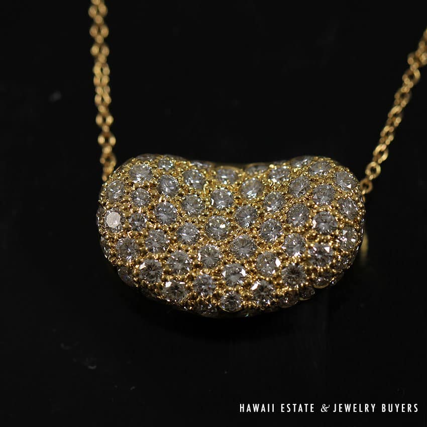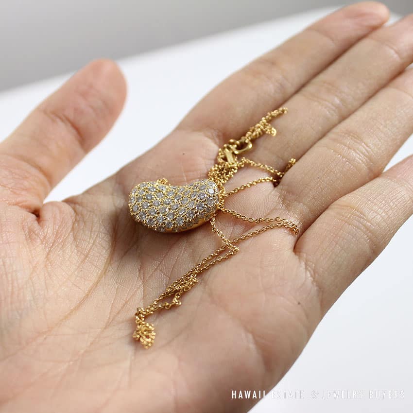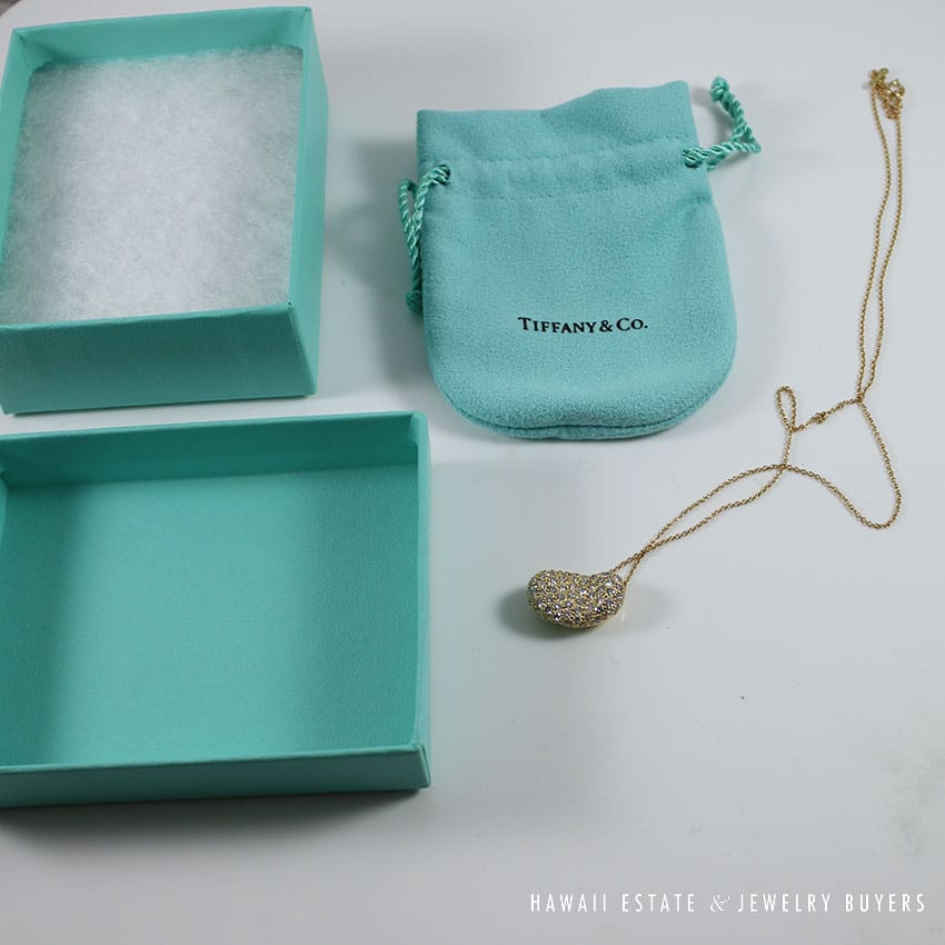DescriptionMaterial: 18K Yellow Gold & DiamondSTAMPED: TIFFANY & CO 18K PERETTIComes with original Tiffany & Co. Pouch AND BOX as picturedSKU: 1880-04$3,500.00Out of stockSKU: 1880-04Category: Pre-owned Designer JewelryTags: bean necklace, diamond bean, elsa pretti, pretti, tiffany, tiffany & co., tiffany and co, tiffany and company, tiffany necklaceRelated StylesTIFFANY & CO. NATURAL GIA BLUE SAPPHIRE & .77CTW DIAMOND PLATINUM RING W/ PAPERS SIZE 6$10,000.00GIA 0.57 ROUND BRILLIANT TACORI DANTELA 18K WHITE GOLD ENGAGEMENT RING – E VVS1$5,600.00Bernard K Passman Black Coral 18K White Gold Diamond Ring$1,900.00TIFFANY & CO. 15MM SOUTH SEA CULTURED PEARL PLATINUM ELSA PERETTI PENDANT & NECKLACE 32″ WITH FOLIO, BOX & PAPER$8,000.00