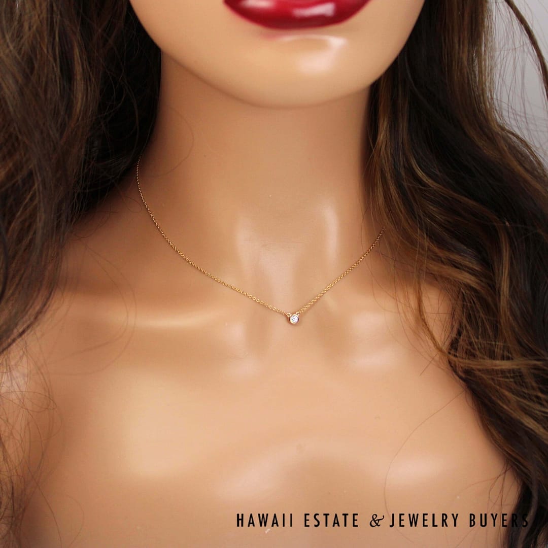16 inch necklace has 0.10ct SI1 GH diamond bezel set at center.