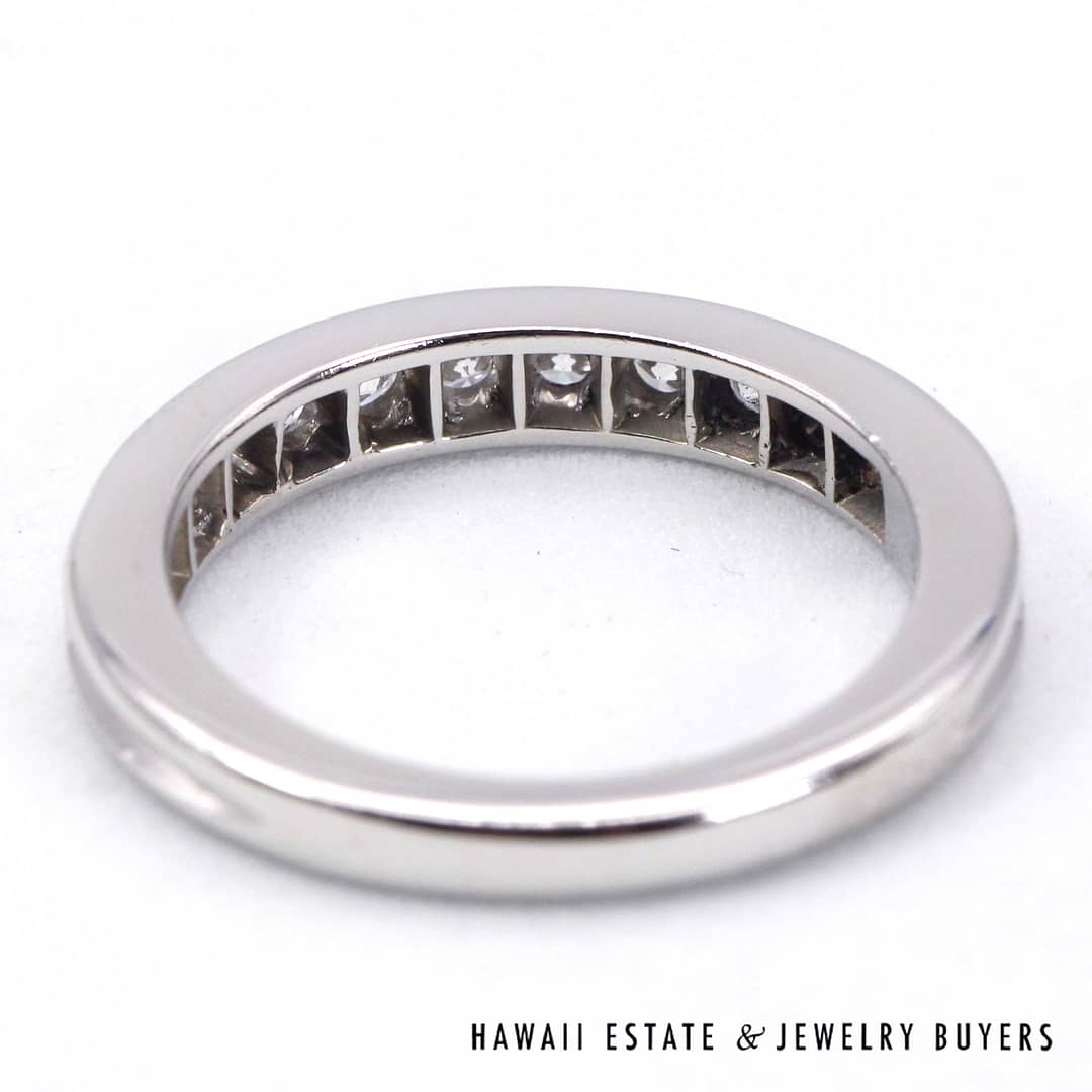 This exquisite Tiffany & Co. wedding band features a classic channel-set design with brilliant round-cut diamonds elegantly set in lustrous platinum.