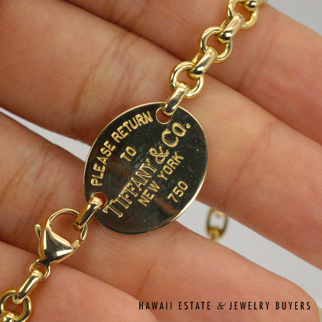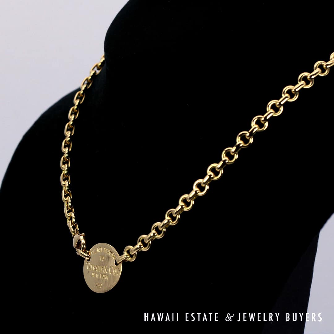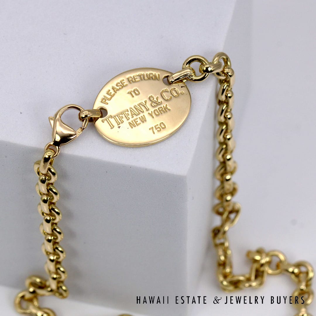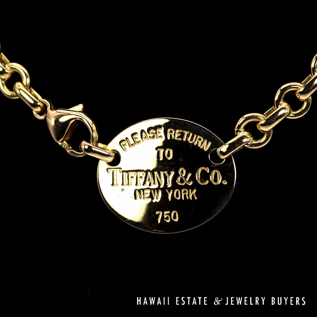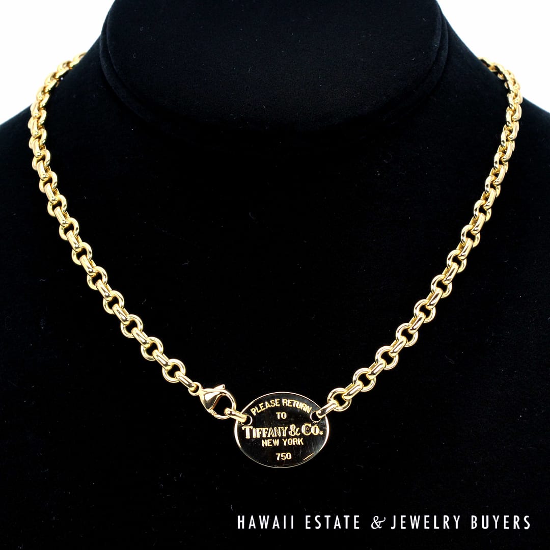 Authentic Tiffany & Co. "Please Return to Tiffany" necklace crafted in solid 18K yellow gold, featuring a bold link chain and signature engraved tag pendant.