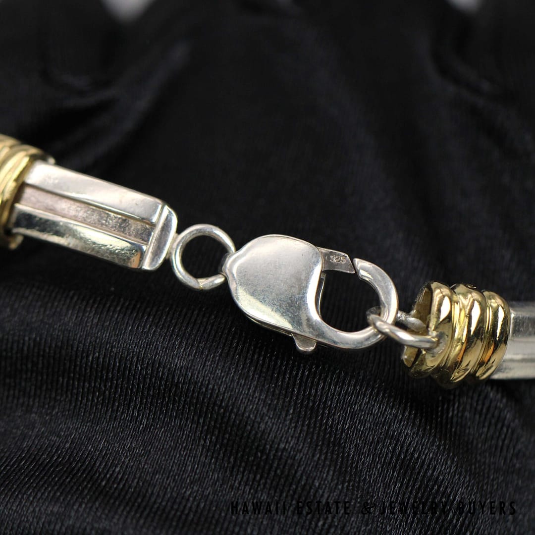 Set consists of 16 inch necklace, 7 inch bracelet, and two pairs of J-hoop earrings with yellow gold posts and sterling silver omega clips, one pair measures 19mm and the other 24mm length.