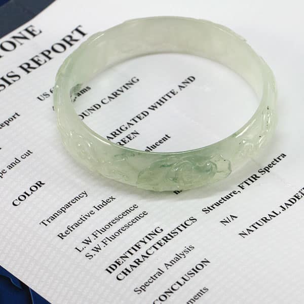 DescriptionEGL USA Report# US69401105CWeight: 40.8gShape & Cut: Round CarvingColor: Variegated White and GreenTransparency: TranslucentRefractive Index: 1.66 spotConclusion: Natural Jadeite JadeSKU: 0822-06$4,800.00Out of stockSKU: 0822-06Category: Pre-owned Vintage & Jade JewelryRelated Styles22.8g 18KWG TYPE A IMPERIAL JADE BUDDAH HAND CARVING w/2.50ctw DIAMOND PENDANT MEASURES 58x28mm (1395-01)$13,900.00Certified Jade White Carved Bangle Bracelet$5,300.00Certified Grade A Natural Jade Cabochon Ring$5,800.00Natural GIA Certified Ruby Diamond Ring$6,800.00