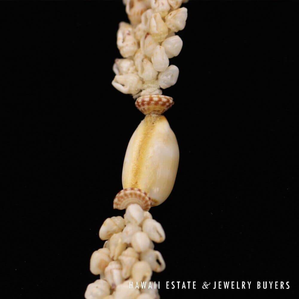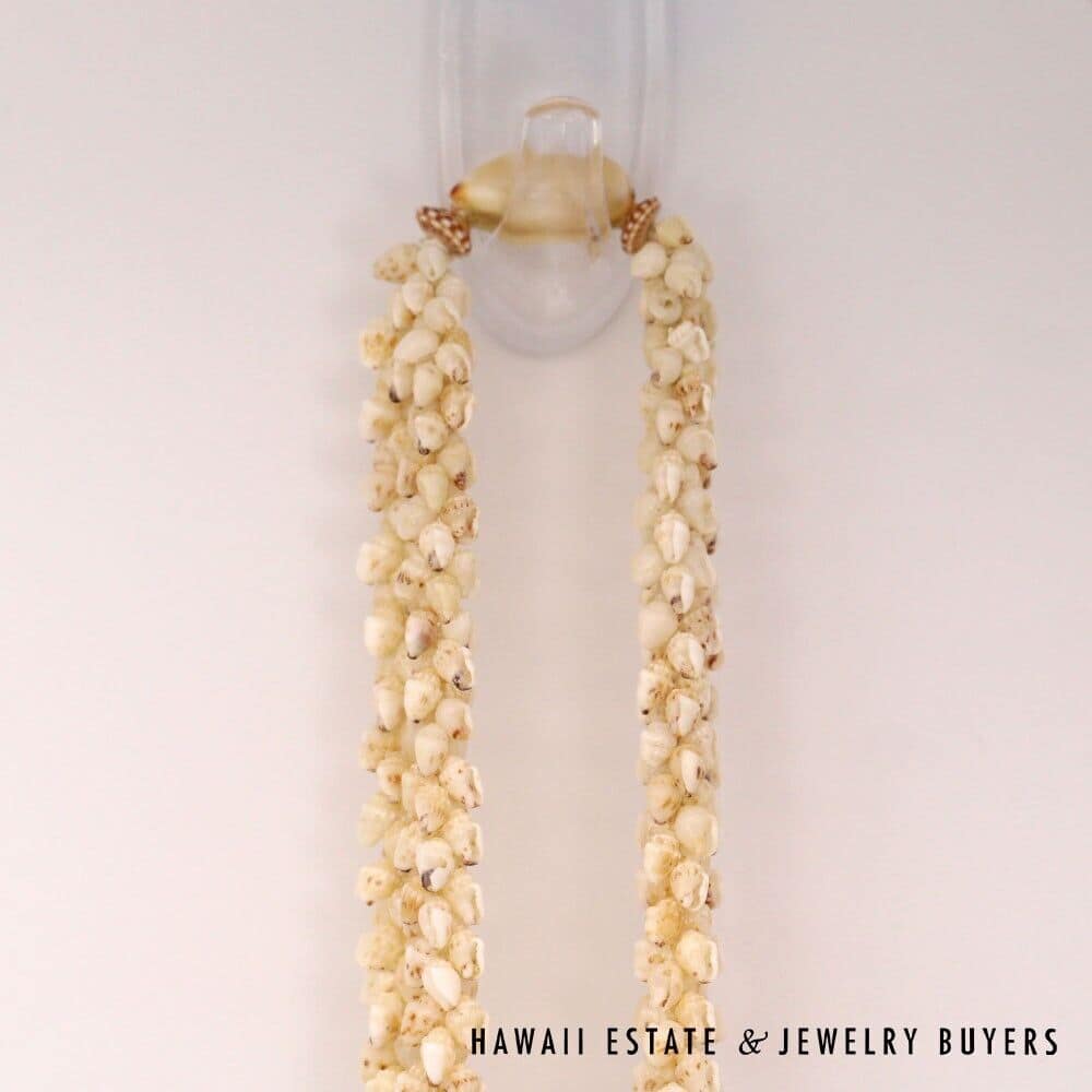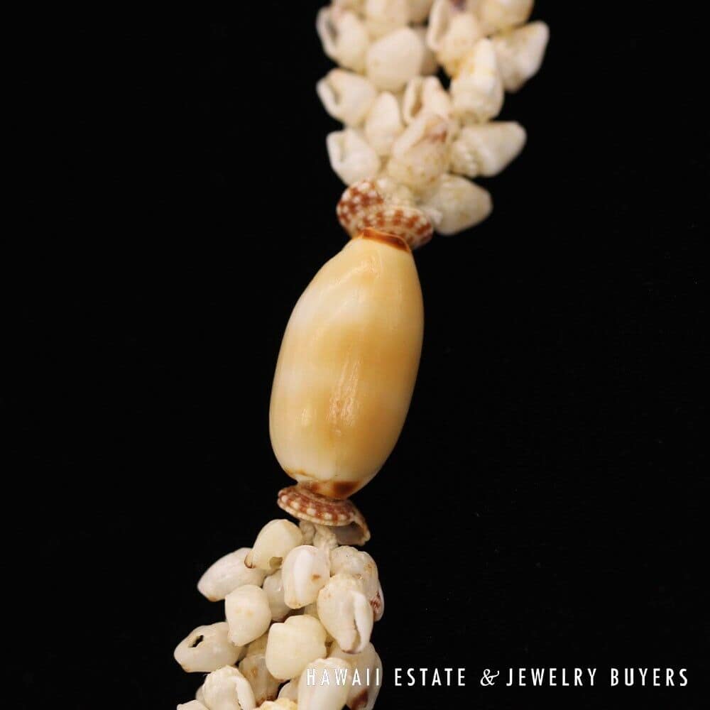 All shells are of the Momi (Dove shell) variety with Lenalena (slightly yellow/off-white) coloring. Both strands are connected by a 21mmX10mm Pōleholeho (decorative shell which ties the ends of each strand together) of the Elelu (smooth cowrie) variety with a light gold color.