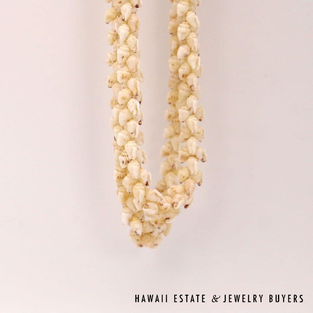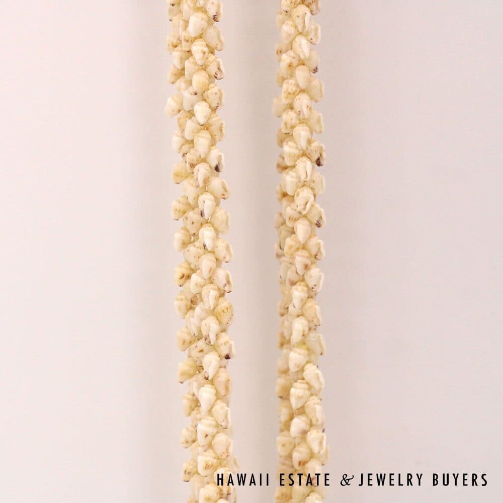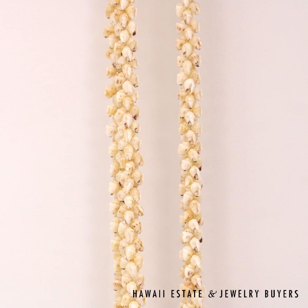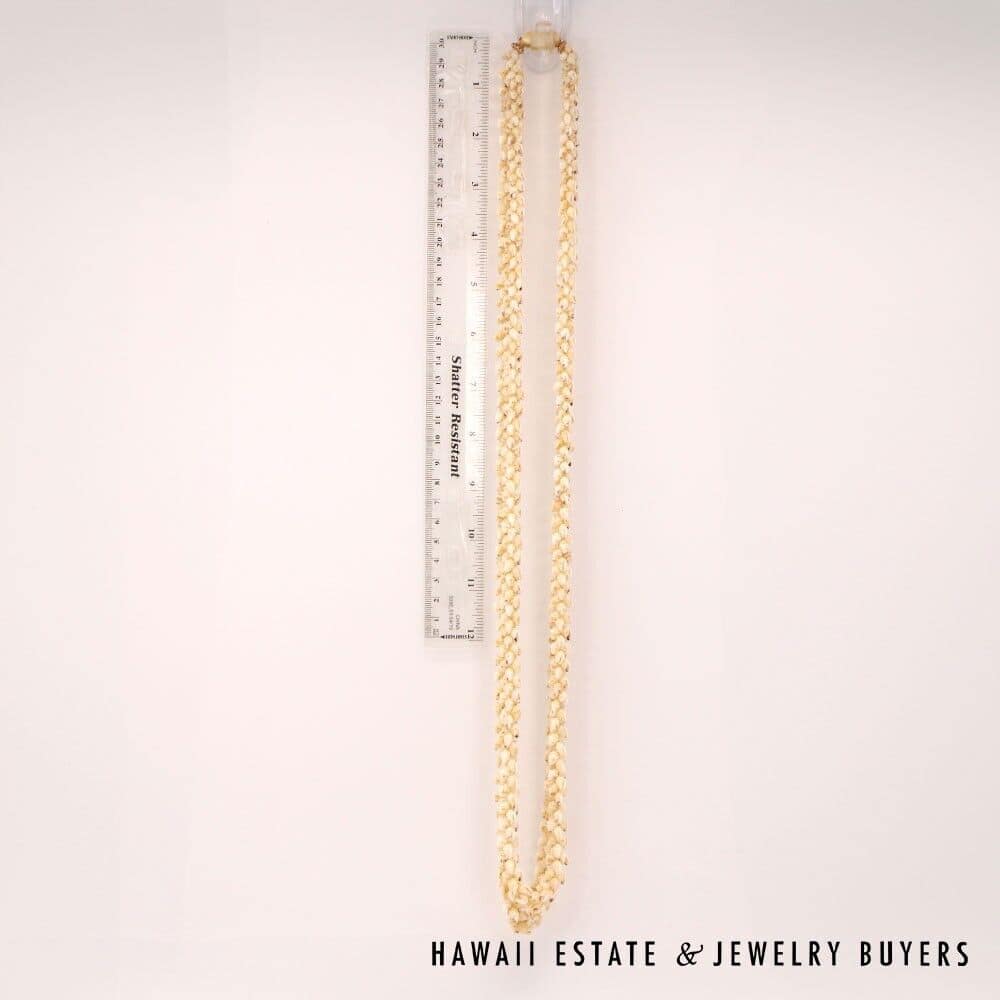 All shells are of the Momi (Dove shell) variety with Lenalena (slightly yellow/off-white) coloring. Both strands are connected by a 21mmX10mm Pōleholeho (decorative shell which ties the ends of each strand together) of the Elelu (smooth cowrie) variety with a light gold color.