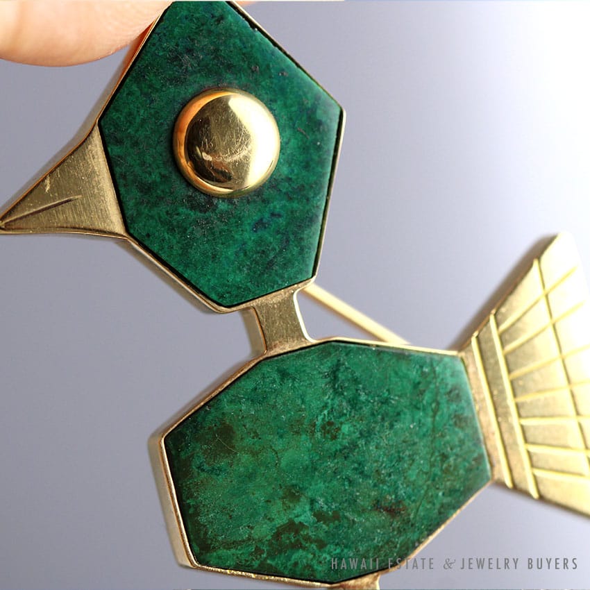 THIS BEAUTIFUL AND VERY UNUSUAL BROOCH IS HIGH POLISHED YELLOW GOLD STAMPED 18K AND IS SET WITH TWO TABLETS OF MAW SIT SIT FORMING GEOMETRIC, STYLIZED BIRD. BACK OF PIECE HAS HINGED AND LOCKING PINSTEM. PIECE MEASURES APPROX. 44 X 32mm WITH A WEIGHT OF 10.8 GRAMS.