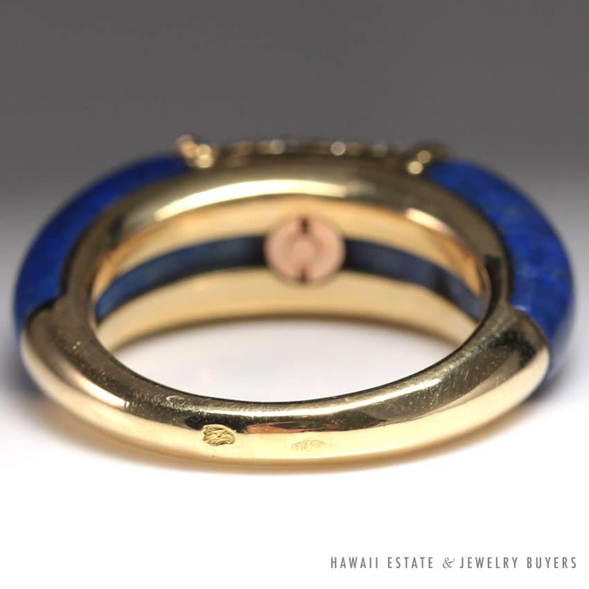 LADY’S DESIGNER YELLOW GOLD, STAMPED: 18K SIGNED: VAN CLEEF & ARPELS B 5001 LAPIS LAZULI AND DIAMOND BAND. The ring contains 18 fine round brilliant cut diamond melee are pave set into the to center of the ring with a rope gold border design. Measuring approx. 2.0 mm. diameters. Weight: approx. .53 carats total.  Color:  D – E   Clarity:  VVS2. The ring has two end sections of carved natural blue Lapis Lazuli from Afganistan. The pieces are barreled and tapered and fit into the ring. The ring tapers from 2.74 – 6.78 mm.  Circa: 1990’s
