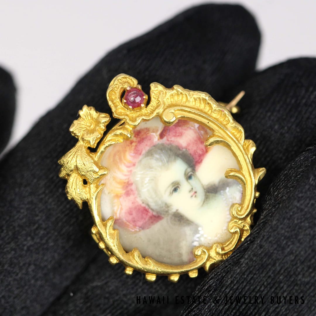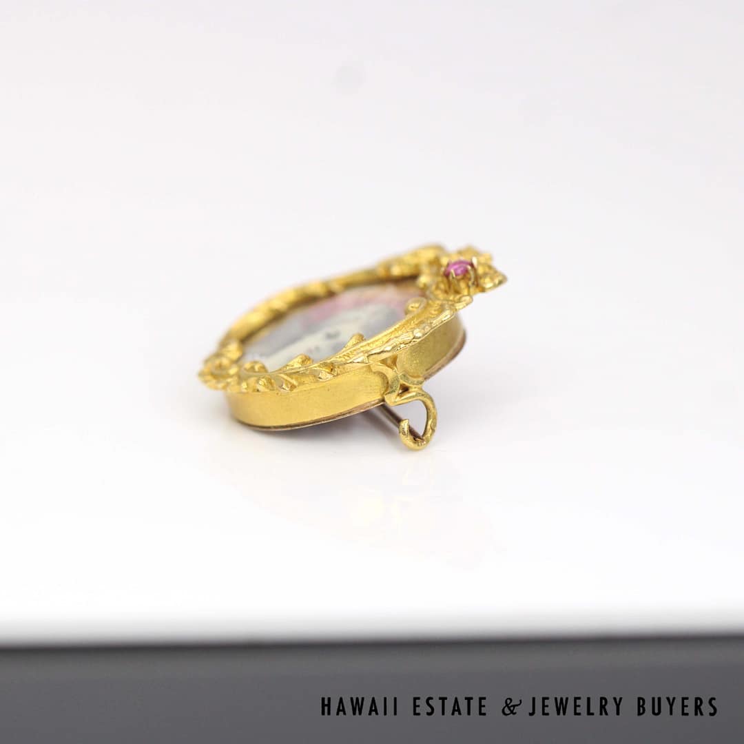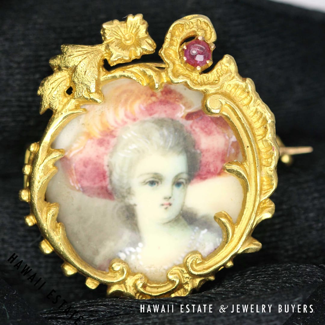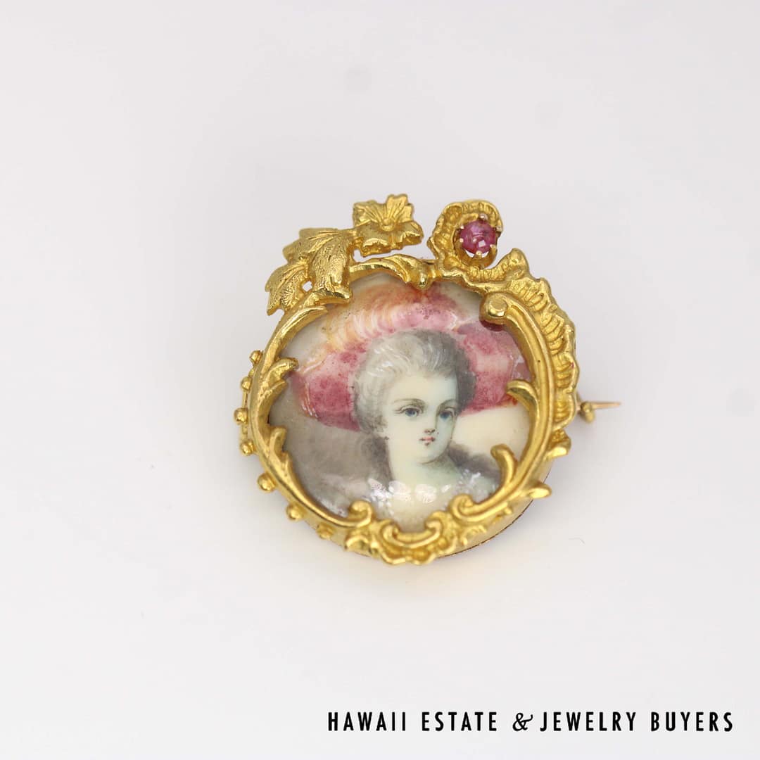 VINTAGE 1800's Portrait appears to be painted rather than printed. Hair chamber is empty and clean. Piece measures approx. 27 x 23mm. Ruby cabochon is approx. 2.7mm.
