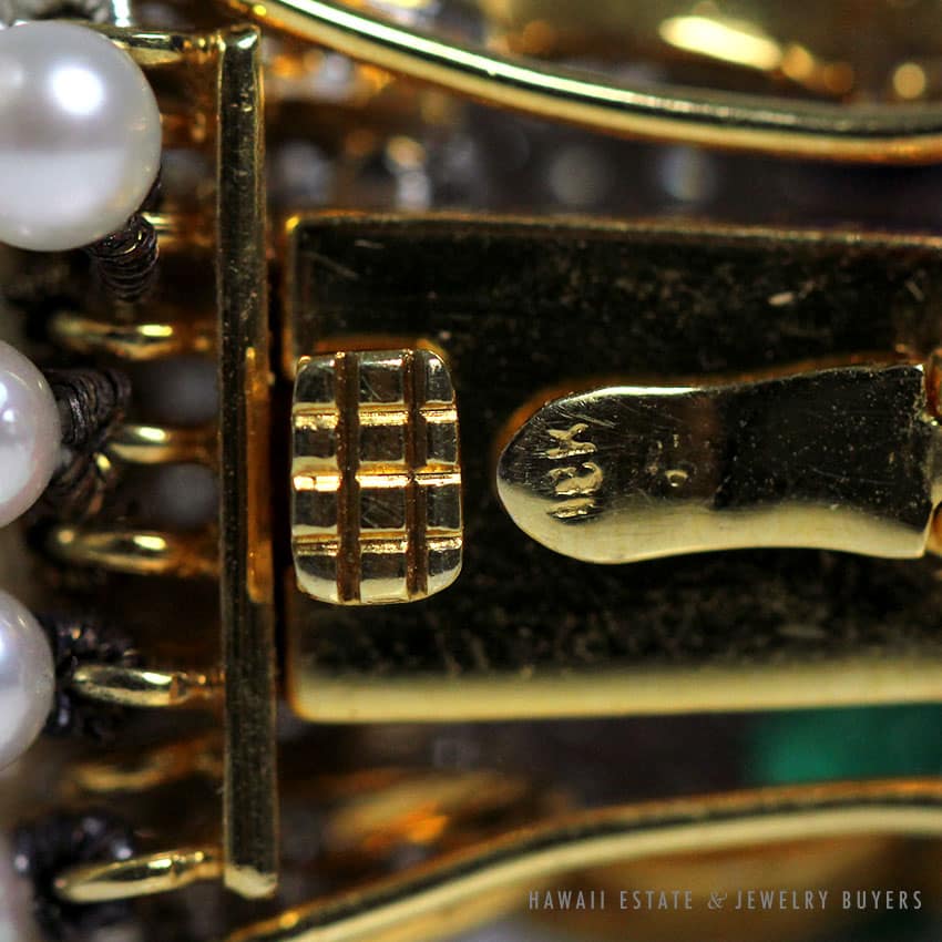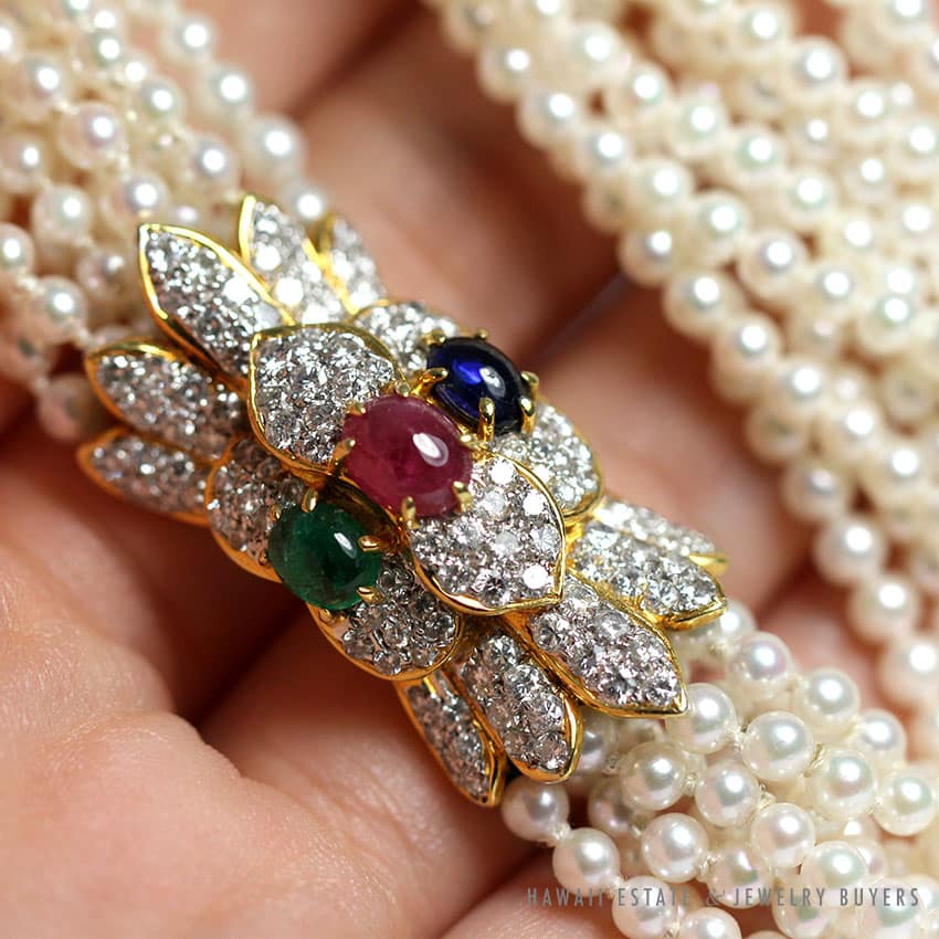 DescriptionSTAMPED: 18K; PROFESSIONALLY POLISHED!LADY’S YELLOW GOLD STAMPED 18K NATURAL EMERALD, RUBY & SAPPHIRE CABOCHON & DIAMOND MULTI-STAND CULTURED SEED PEARL BRACELET. $7,900.001 in stockVINTAGE 10 STRAND SEED PEARL & DIAMOND RUBY SAPPHIRE EMERALD 18K GOLD BRACELET quantityAdd to cartBuy withMake OfferSKU: 1962-07Category: Pre-owned Vintage JewelryRelated StylesGIA CERTIFIED NATURAL GRADE A LAVENDER JADEITE JADE PENDANT W/ DIAMONDS$5,900.00Antique Victorian Pearl Old Mine Cut Diamond Circle Pin$2,100.0022.8g 18KWG TYPE A IMPERIAL JADE BUDDAH HAND CARVING w/2.50ctw DIAMOND PENDANT MEASURES 58x28mm (1395-01)$13,900.00GIA CERTIFIED MARQUISE NATURAL JADE APPLE GREEN COLOR JADE RING GIA JADE SZ 5.25$1,000.00