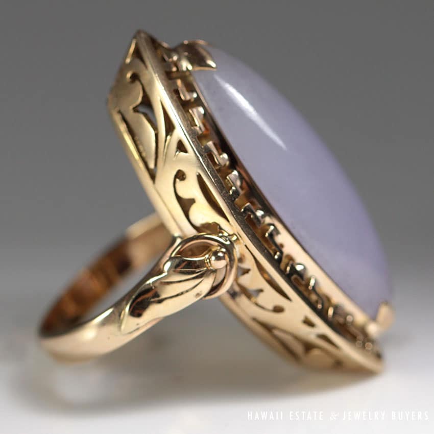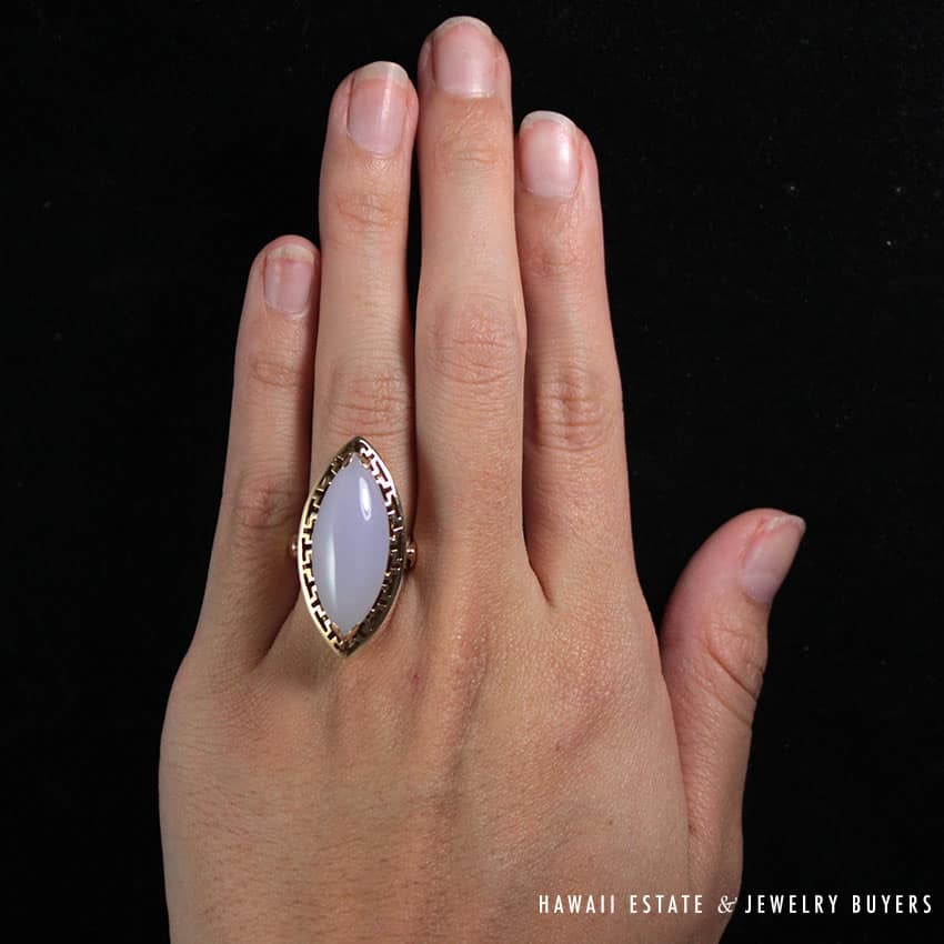 DescriptionMetal: 14K Yellow GoldJade measures 27.55 x 11.31 x 6.50 mmSize: 4SKU: 1654-27$1,600.001 in stockVintage 1970's Lavender Jade Marquise 14K Ring quantityAdd to cartBuy withMake OfferSKU: 1654-27Category: Pre-owned Vintage & Jade JewelryRelated StylesNatural Lavender Cabochon Pendant$2,300.00Natural Grade A White Jade Archer Ring$3,800.00Certified Jade White Carved Bangle Bracelet$5,300.00Thick Certified Grade A Natural Jade Hinged Bangle$4,250.00