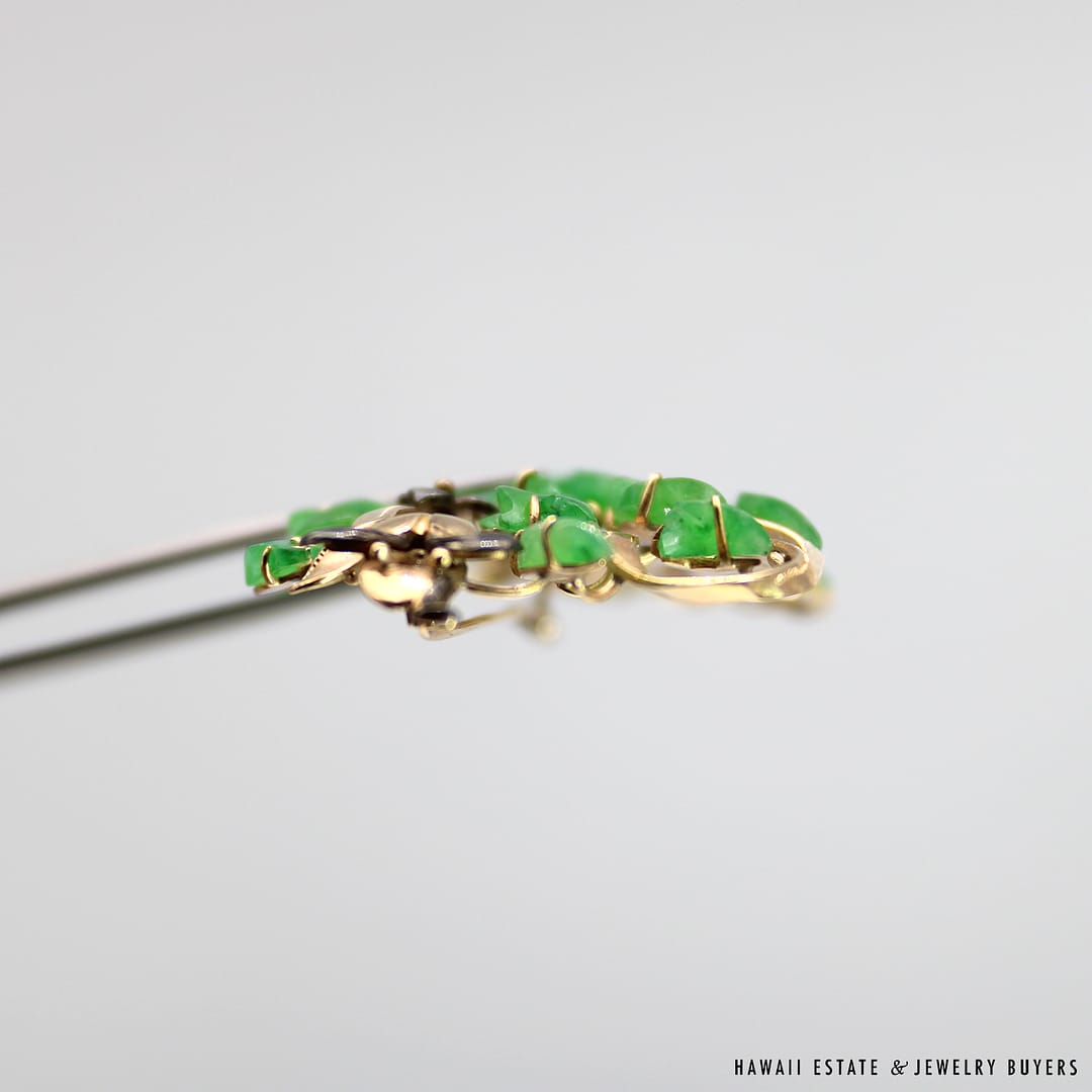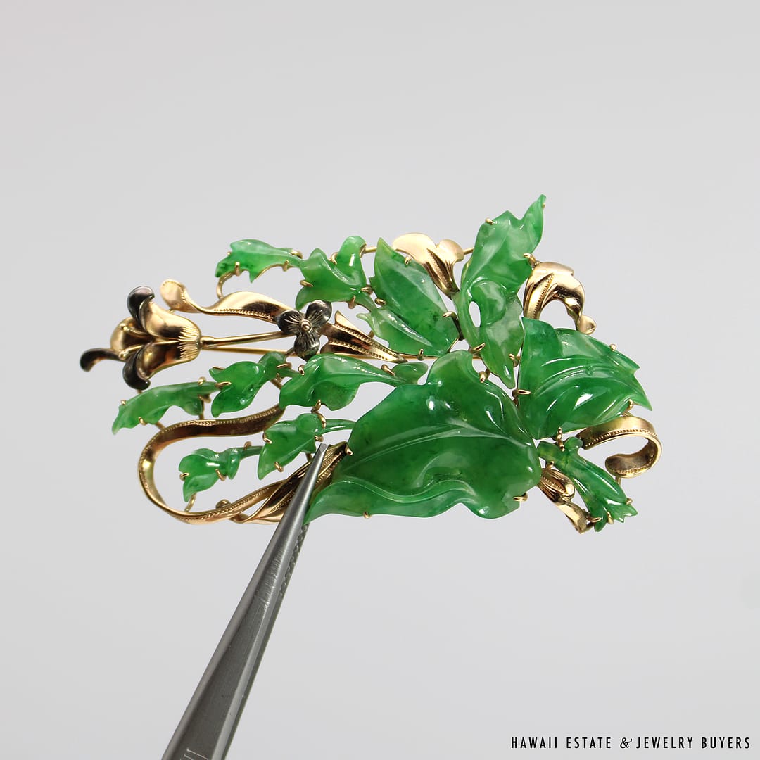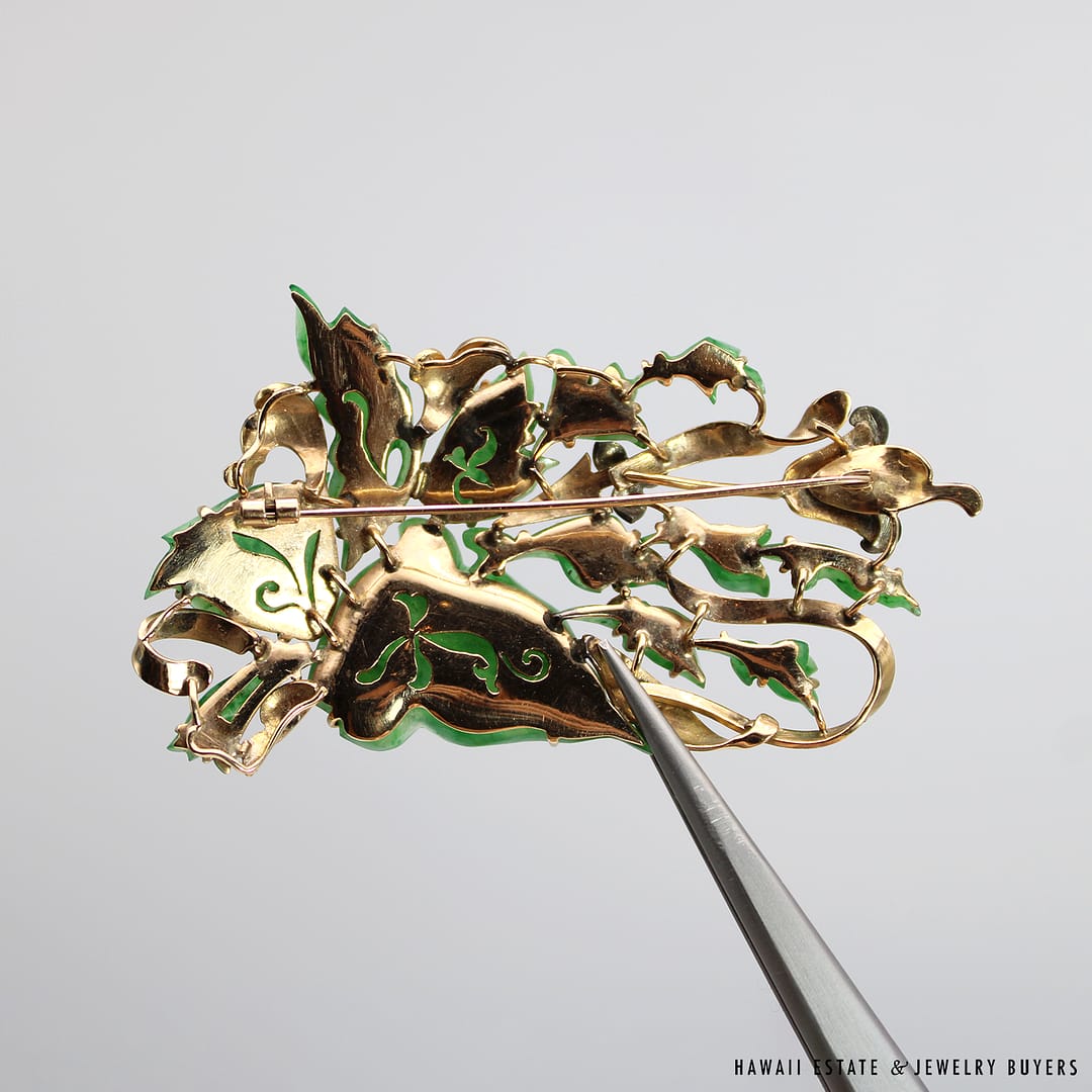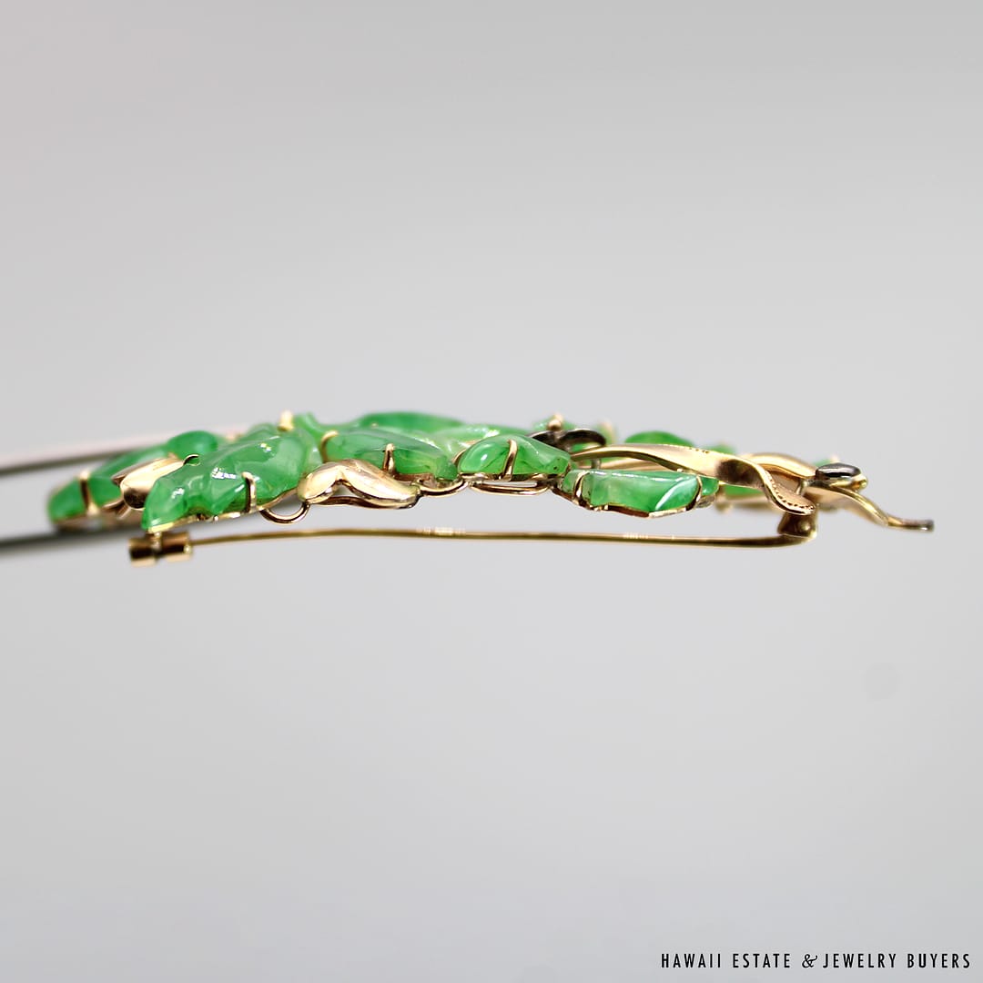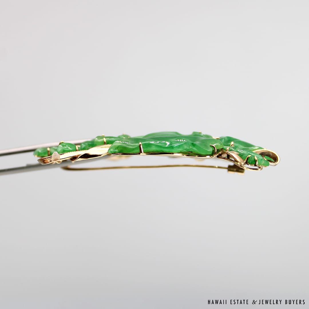 Description14KYG MOTTLED GREEN JADE BROOCHWEIGHT: APPROX. 20.6gMEASURES: APPROX. 72x40mmACID TESTED 14KYG$7,500.001 in stockVINTAGE 20.6g 14KYG CARVED MOTTLED GREEN JADE BROOCH quantityAdd to cartBuy withMake OfferSKU: 2590-02Category: Pre-owned Vintage & Jade JewelryTags: 14k, 14k yellow gold, brooch, green jade, jade, jade broochRelated StylesCertified Twisted White Nephrite Jade Bangle$6,000.0022.8g 18KWG TYPE A IMPERIAL JADE BUDDAH HAND CARVING w/2.50ctw DIAMOND PENDANT MEASURES 58x28mm (1395-01)$13,900.00GIA Grade A Nephrite Jade Twist Bangle$3,500.00Estate Large 18mm South Sea Pearl Necklace$18,000.00