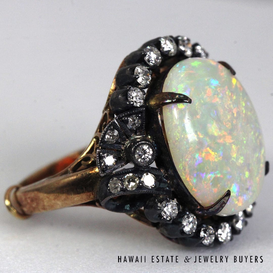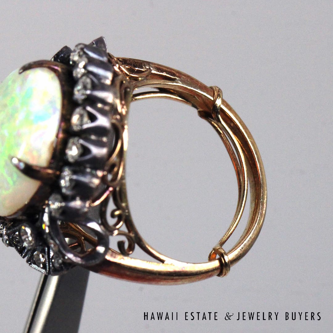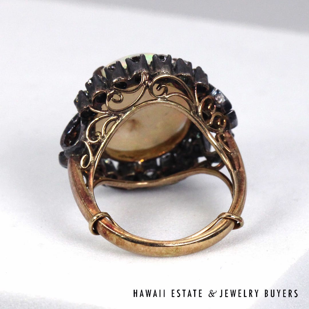 Vintage ring featuring a luminous 5ct oval opal with vibrant play-of-color, framed by approximately 0.70ctw of sparkling diamonds in a 12K gold and sterling silver setting, size 4.