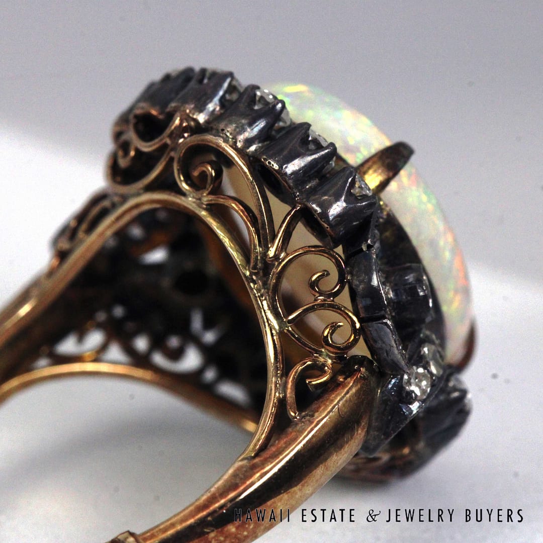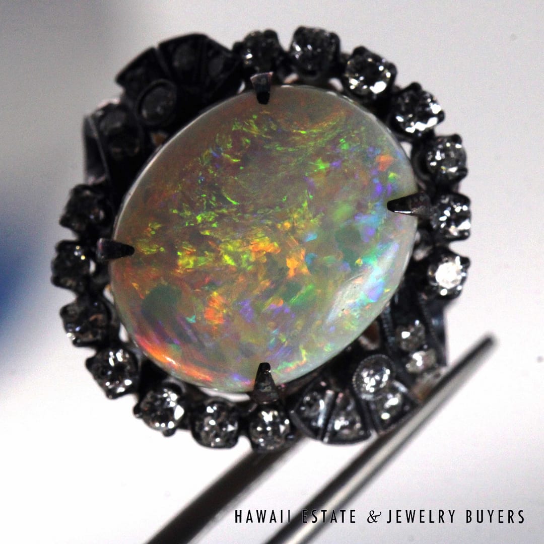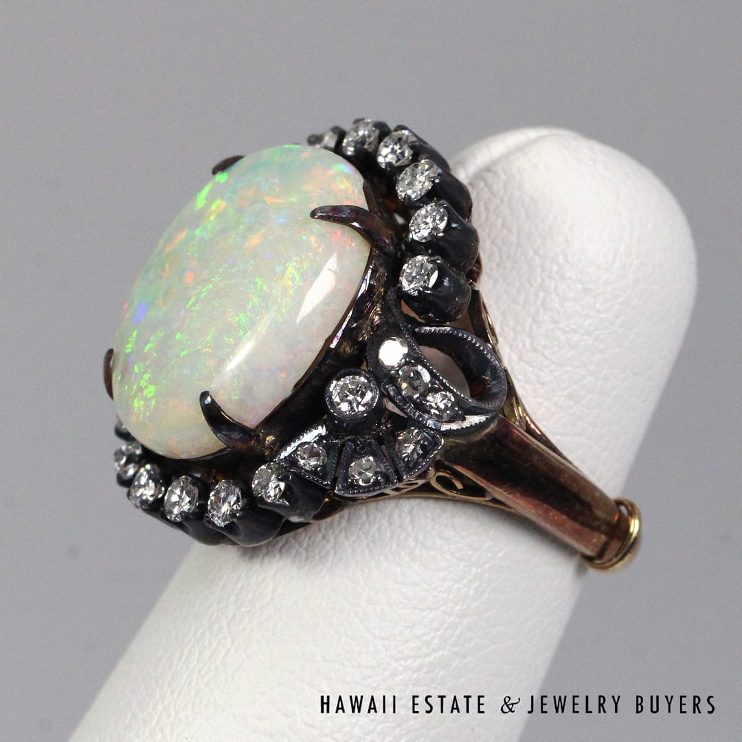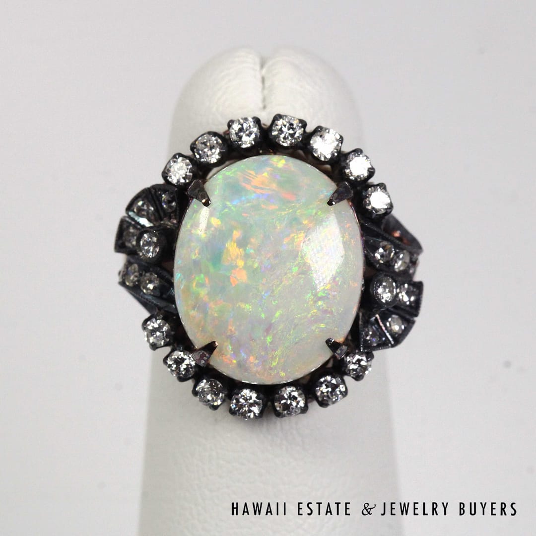 Vintage ring featuring a luminous 5ct oval opal with vibrant play-of-color, framed by approximately 0.70ctw of sparkling diamonds in a 12K gold and sterling silver setting, size 4.