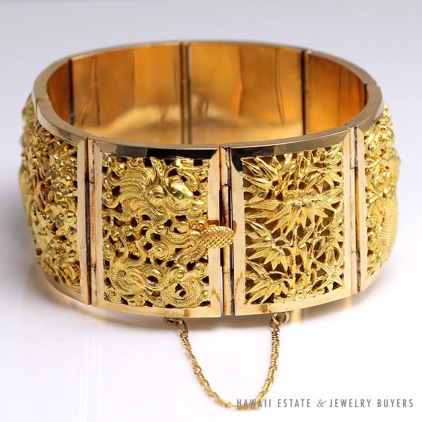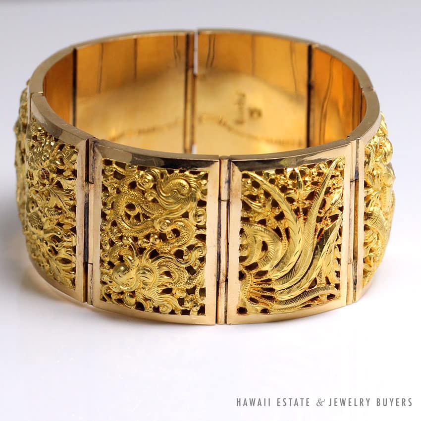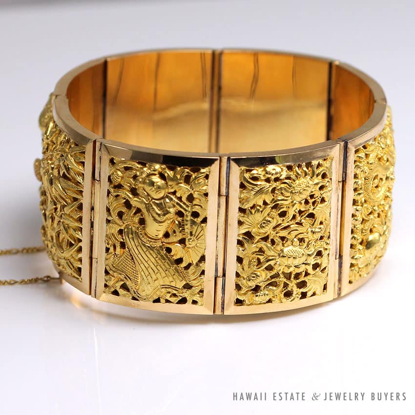 DescriptionMultiple scene hand engraved 18k yellow gold large link braceletTested “18K”Fits approx 8 inch wristStamped “Baranti”$11,500.001 in stockVINTAGE BARANTI THAI SECTIONAL HAND ENGRAVED 18K YELLOW GOLD LARGE LINK BRACELET quantityAdd to cartMake OfferSKU: 2253-01Category: Pre-owned Designer JewelryRelated StylesTiffany & Co Angela Cummings 18K Earrings$4,500.00Scot Kay .64ct Round Brilliant Rose Gold White Gold Two Tone Engagement Ring (Sz 8.25)$3,800.00Roberto Coin Baby O Earrings$16,000.00PANDORA CHARM BRACELET WITH 13 PANDORA CHARMS STERLING SILVER W/ BOX$500.00