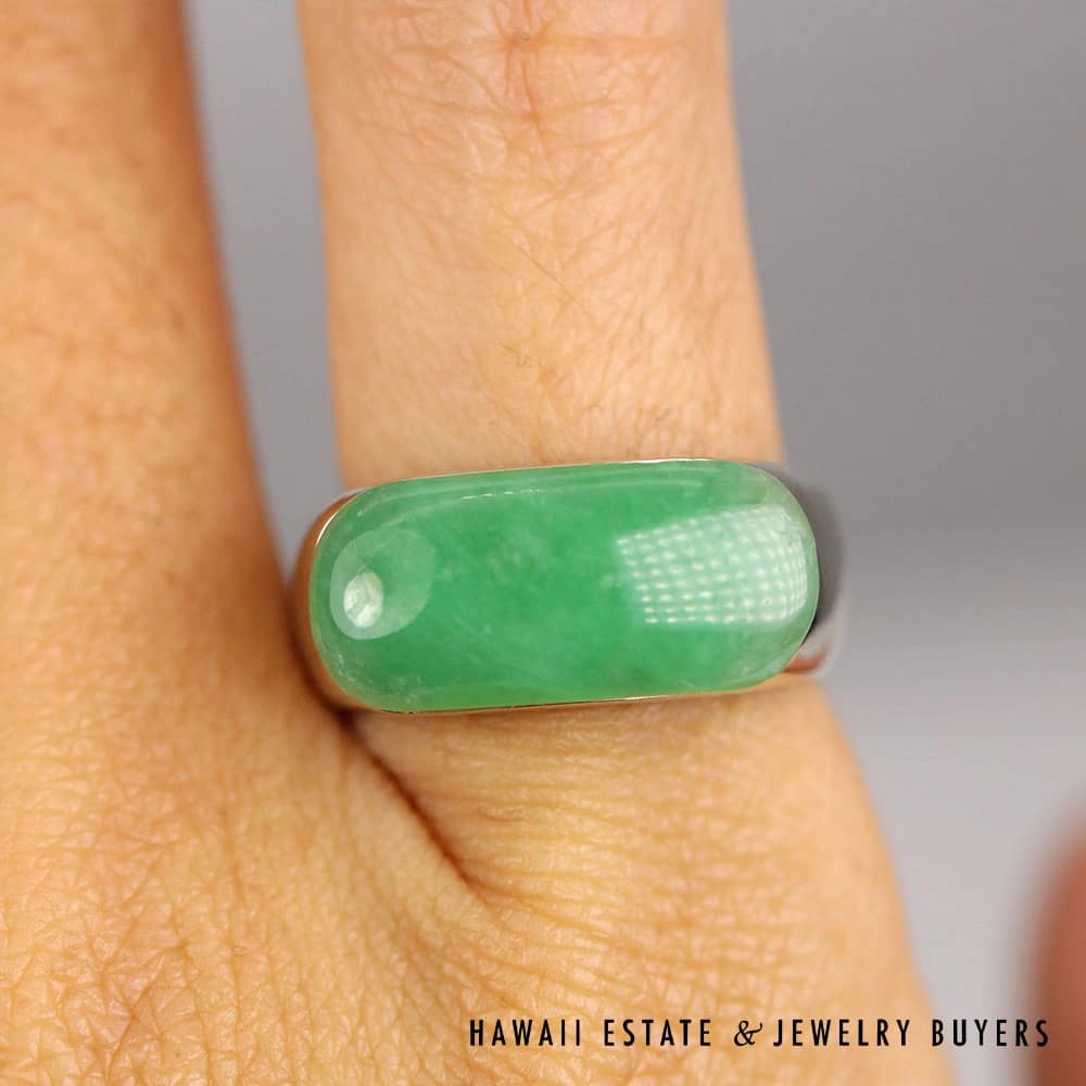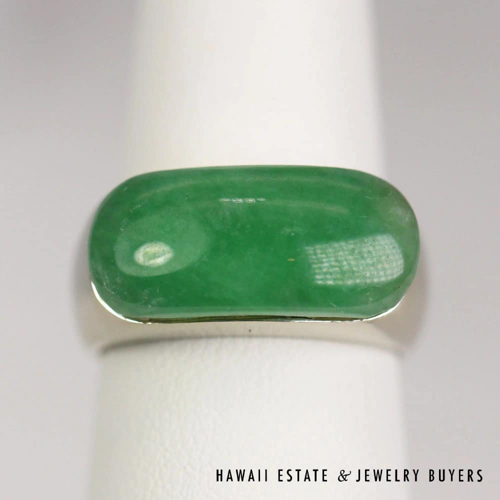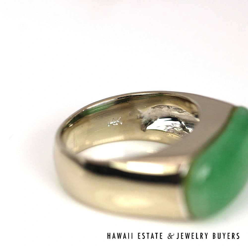 DescriptionThis beautiful vintage saddle ring features a bold green jade set in 14k Yellow Gold in the classic ‘saddle’ east to west setting. Jade measures 19 x 9mm, ring size 6.9.8g 14K GREEN JADE SADDLE RING SIZE 6 (3010-14)$1,400.001 in stockVintage Green Jade 14K Saddle Ring Size 6 quantityAdd to cartBuy withMake OfferSKU: 3010-14Category: Pre-owned Diamond JewelryRelated StylesANTIQUE 2.60CT ROSE CUT PEAR DIAMOND – GIA FANCY LIGHT BROWN-YELLOW RING (SZ 5)$36,000.00Antique 1920’s European Cut Diamond 8.62ctw Platinum Bracelet$20,000.009.27CTW DIAMOND BAGUETTE 18K YELLOW GOLD HINGED BANGLE BRACELET$8,000.00DESIGNER EMERALD & 8.04CTW DIAMOND 18K YELLOW GOLD BRACELET$7,999.00