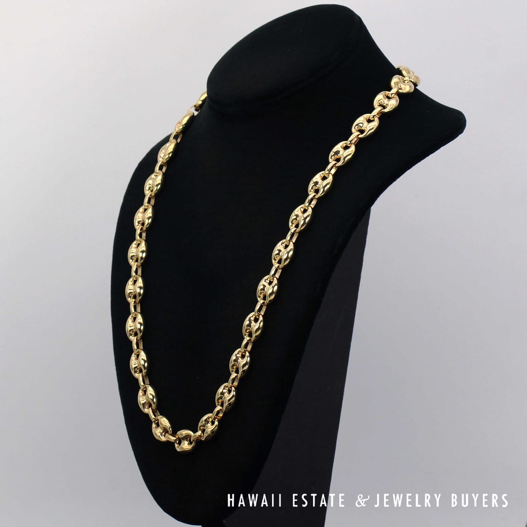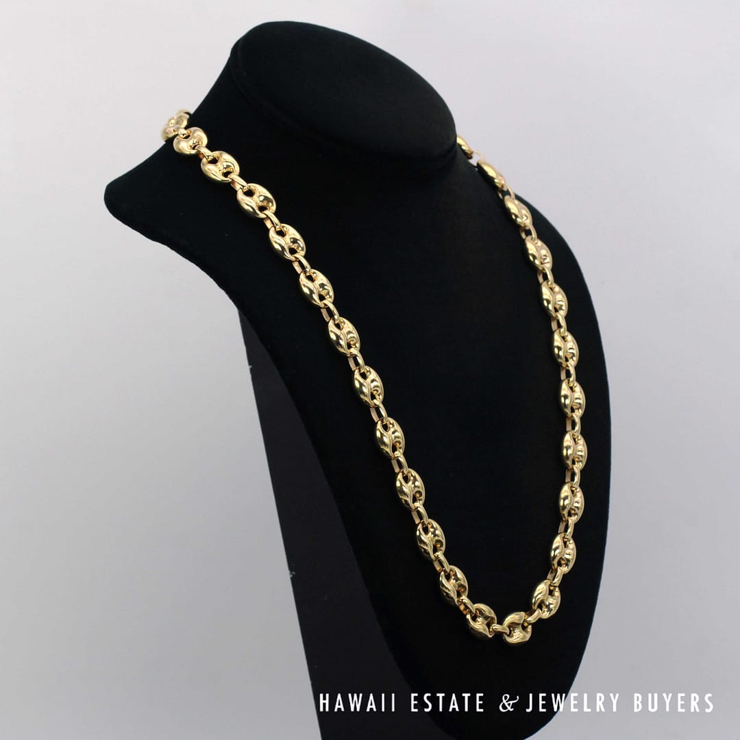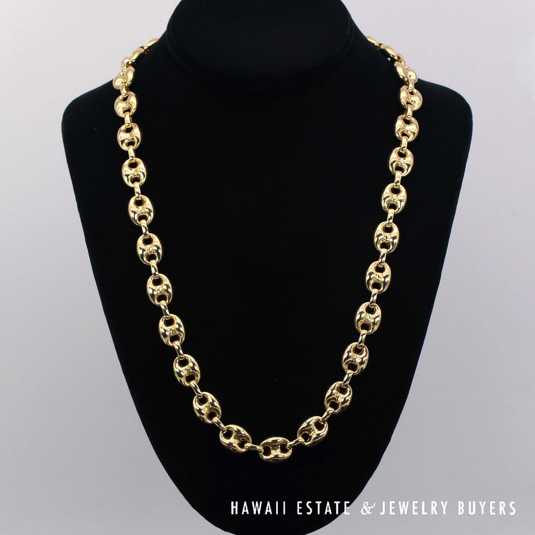 DescriptionVintage Gucci 18K yellow gold statement link chain necklace featuring bold oval links with a high-polish finish.VINTAGE 71.4g 18KYG DOUBLE GOLD GUCCI LINK 24 INCH NECKLACE (3120-02)$9,500.001 in stockVintage Gucci Puff Link 18K Yellow Gold Necklace 24" quantityAdd to cartBuy withMake OfferSKU: 3120-02Category: Pre-owned Designer JewelryRelated StylesMichael B. Diamond Paris 3 sided diamond Pave Rings$10,000.00Michael B. Platinum Eternity Band$1,600.00Tiffany & Co Angela Cummings 18K Earrings$4,500.00GIA 0.57 ROUND BRILLIANT TACORI DANTELA 18K WHITE GOLD ENGAGEMENT RING – E VVS1$5,600.00