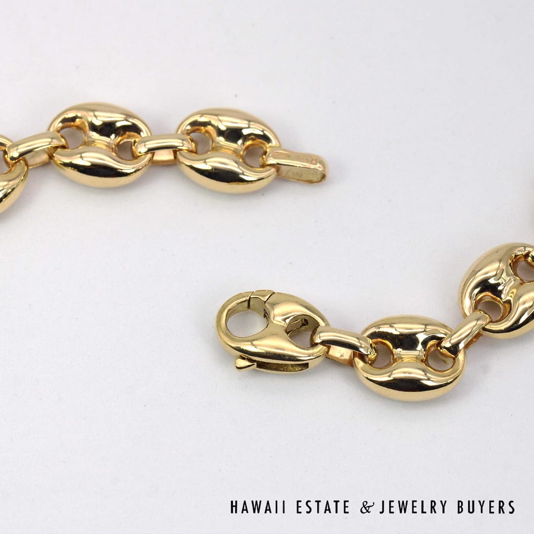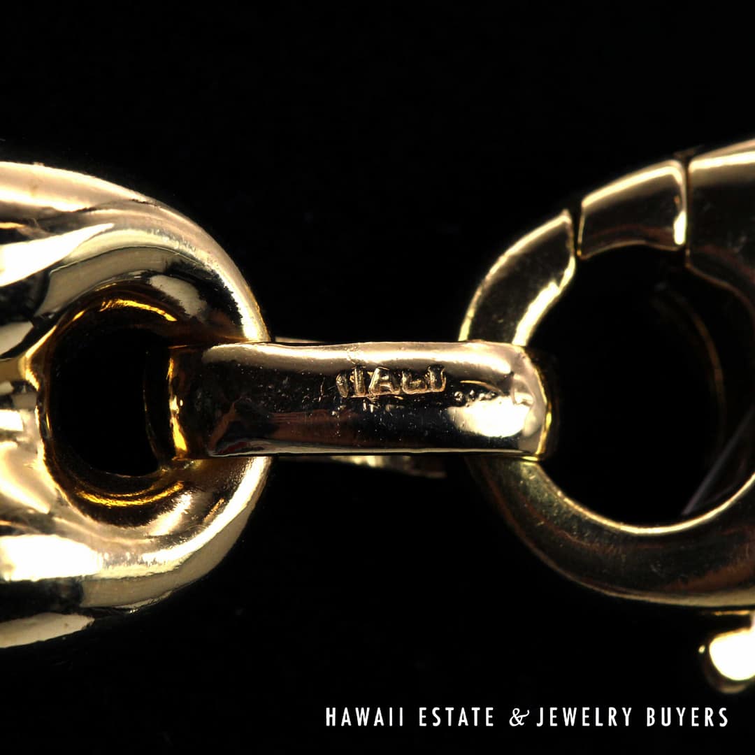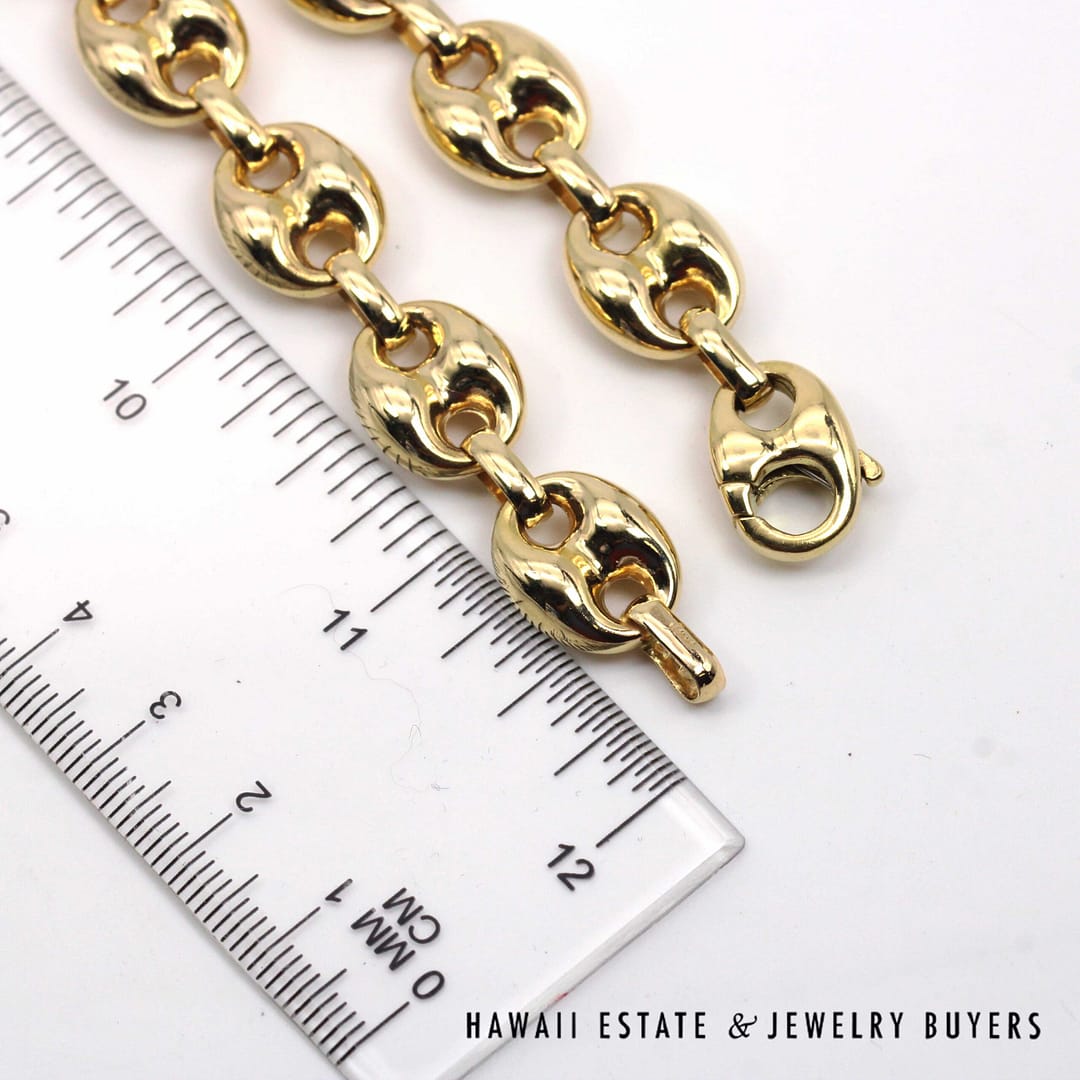 DescriptionVintage Gucci 18K yellow gold statement link chain necklace featuring bold oval links with a high-polish finish.VINTAGE 71.4g 18KYG DOUBLE GOLD GUCCI LINK 24 INCH NECKLACE (3120-02)$9,500.001 in stockVintage Gucci Puff Link 18K Yellow Gold Necklace 24" quantityAdd to cartBuy withMake OfferSKU: 3120-02Category: Pre-owned Designer JewelryRelated StylesMichael B. Diamond Paris 3 sided diamond Pave Rings$10,000.00Michael B. Platinum Eternity Band$1,600.00Tiffany & Co Angela Cummings 18K Earrings$4,500.00GIA 0.57 ROUND BRILLIANT TACORI DANTELA 18K WHITE GOLD ENGAGEMENT RING – E VVS1$5,600.00