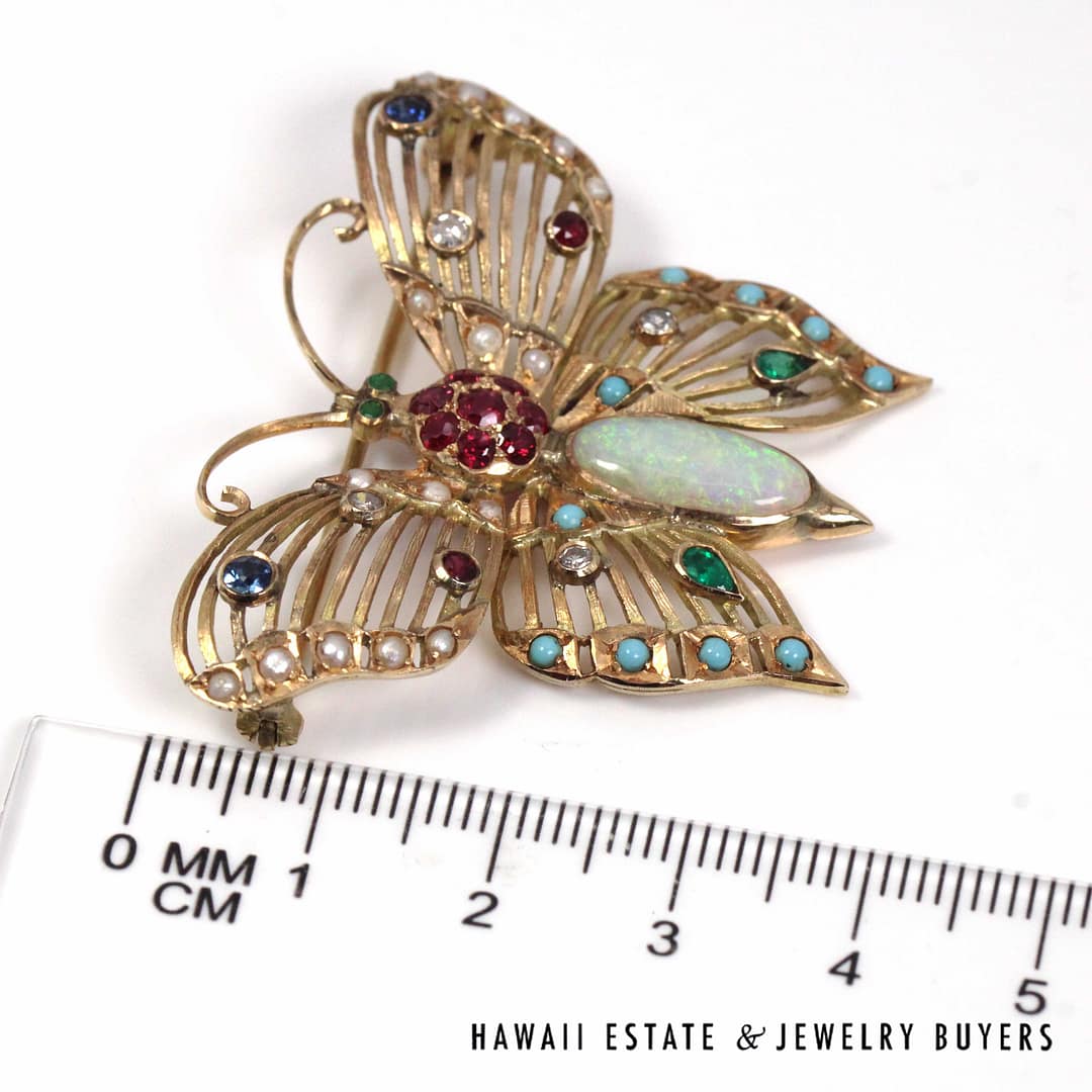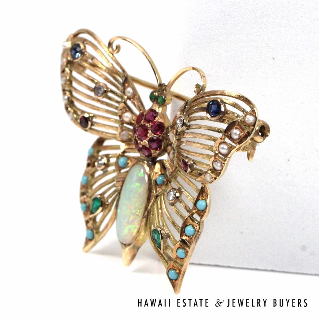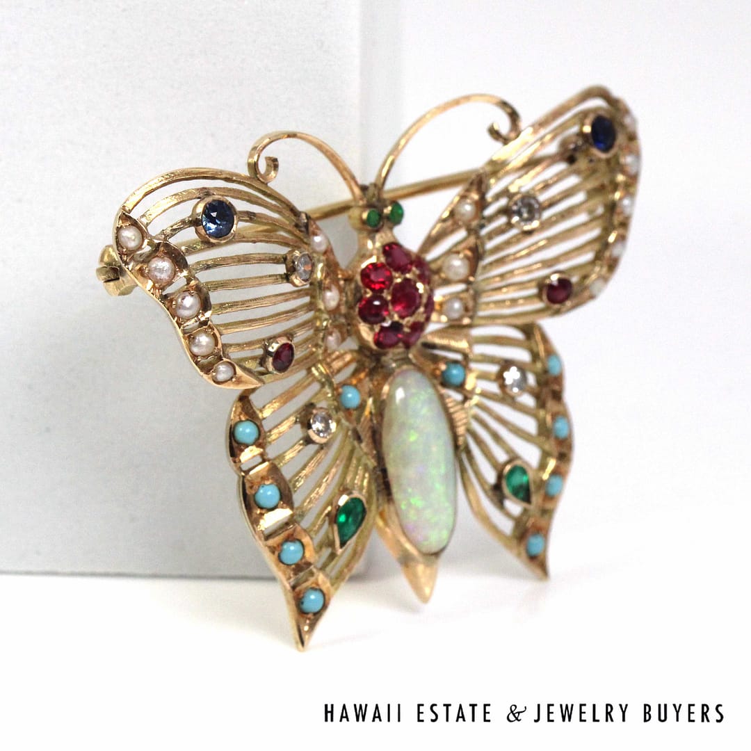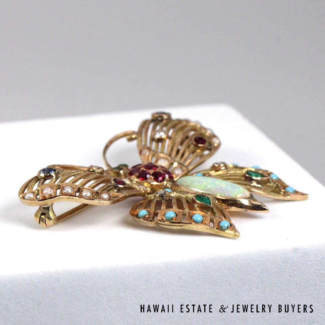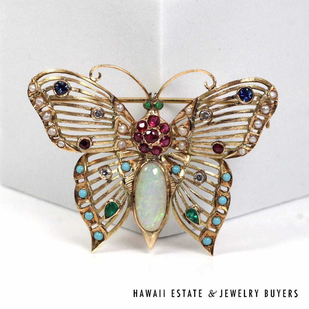 Vintage butterfly brooch crafted in 14K yellow gold, showcasing a striking opal center accented with multi-colored gems in an intricate openwork design.