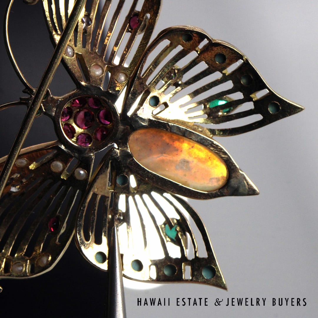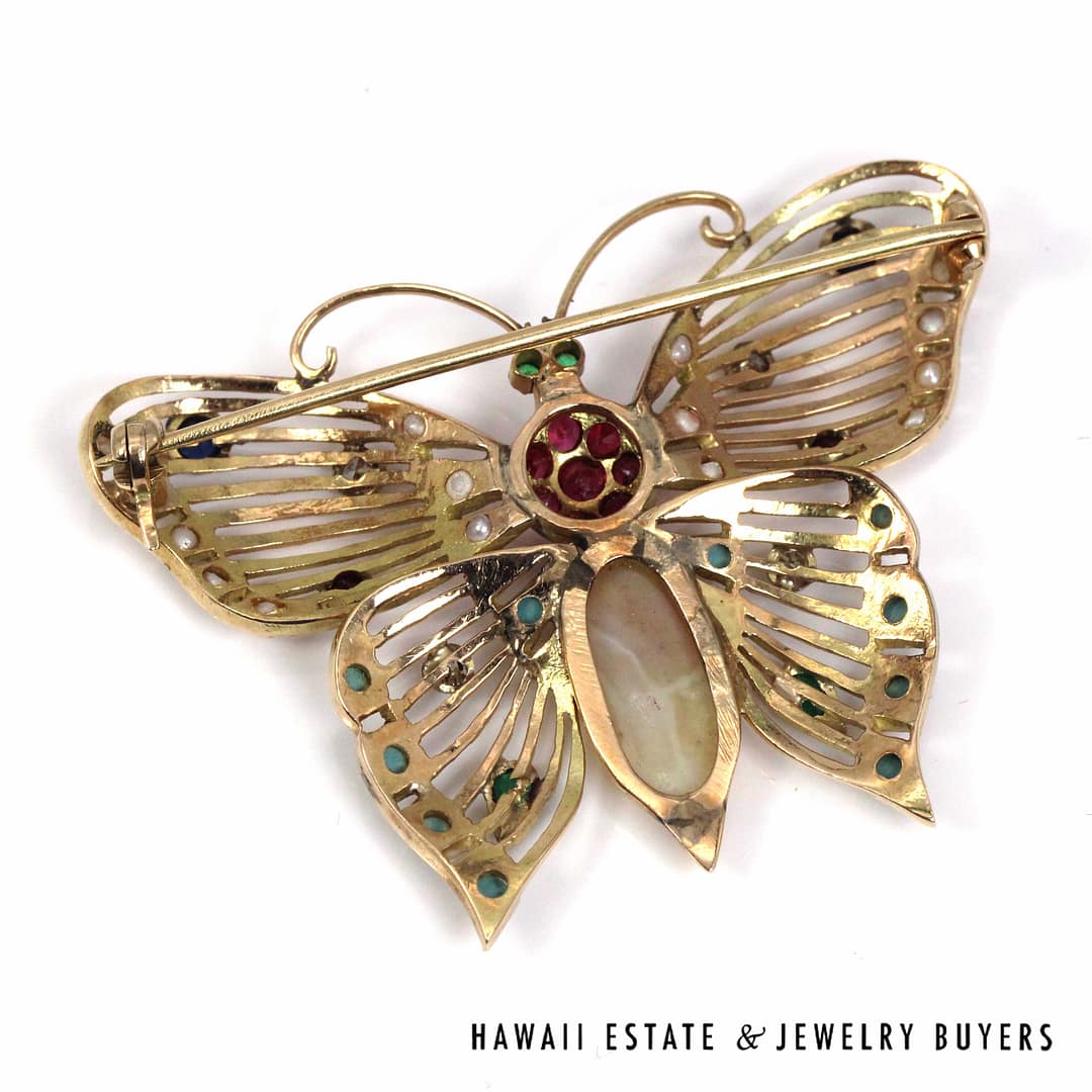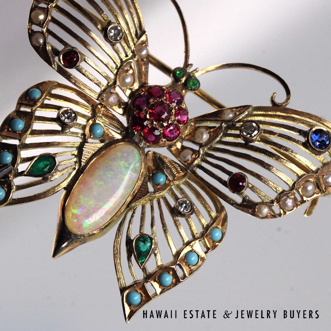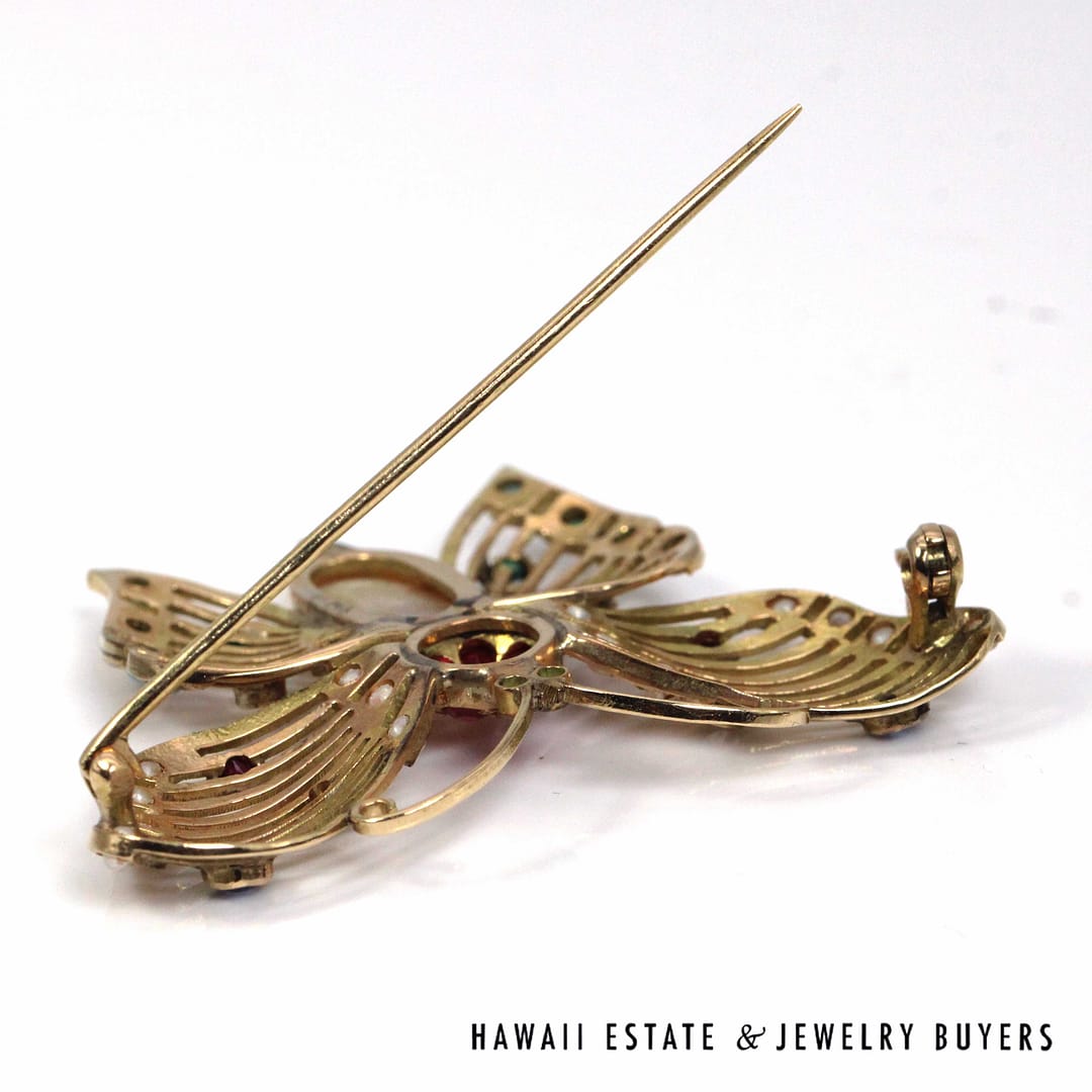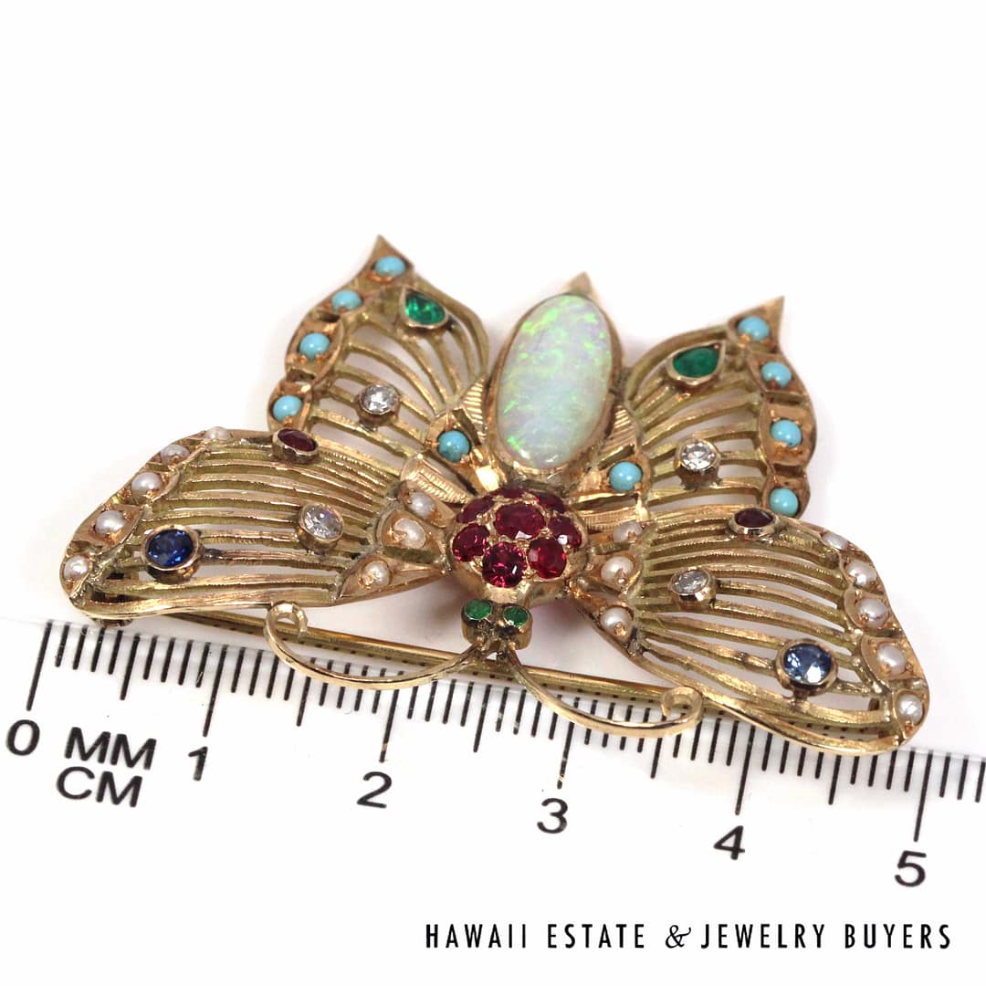 Vintage butterfly brooch crafted in 14K yellow gold, showcasing a striking opal center accented with multi-colored gems in an intricate openwork design.