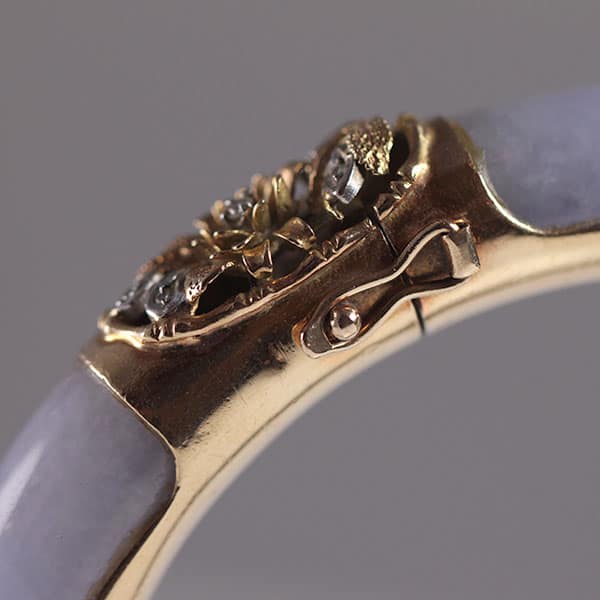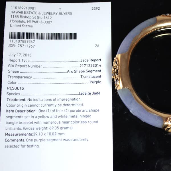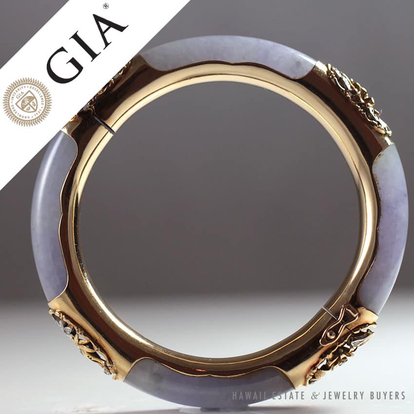 DescriptionCirca: 1960’sGIA Report #: 2171223014Shape: Arc Shape Segment (Hinged Bangle Bracelet)Transparency: TranslucentColor: PurpleMeasurements: 39.10 x 10.02 mmSpecies: Jadeite JadeSKU: 1596-01$7,500.00Out of stockSKU: 1596-01Category: Pre-owned Vintage JewelryRelated StylesCertified Jade White Carved Bangle Bracelet$5,300.00Certified Twisted White Nephrite Jade Bangle$6,000.0022.8g 18KWG TYPE A IMPERIAL JADE BUDDAH HAND CARVING w/2.50ctw DIAMOND PENDANT MEASURES 58x28mm (1395-01)$13,900.00Certified White Nephrite Jade Pendant with Multicolored Stones$8,700.00