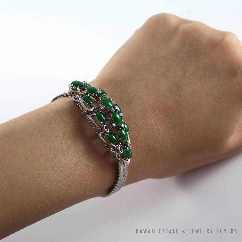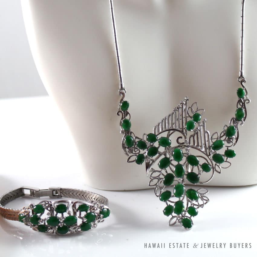 The matching silver bracelet contains 12 matched jadeite old mine green translucent intense colored jades.