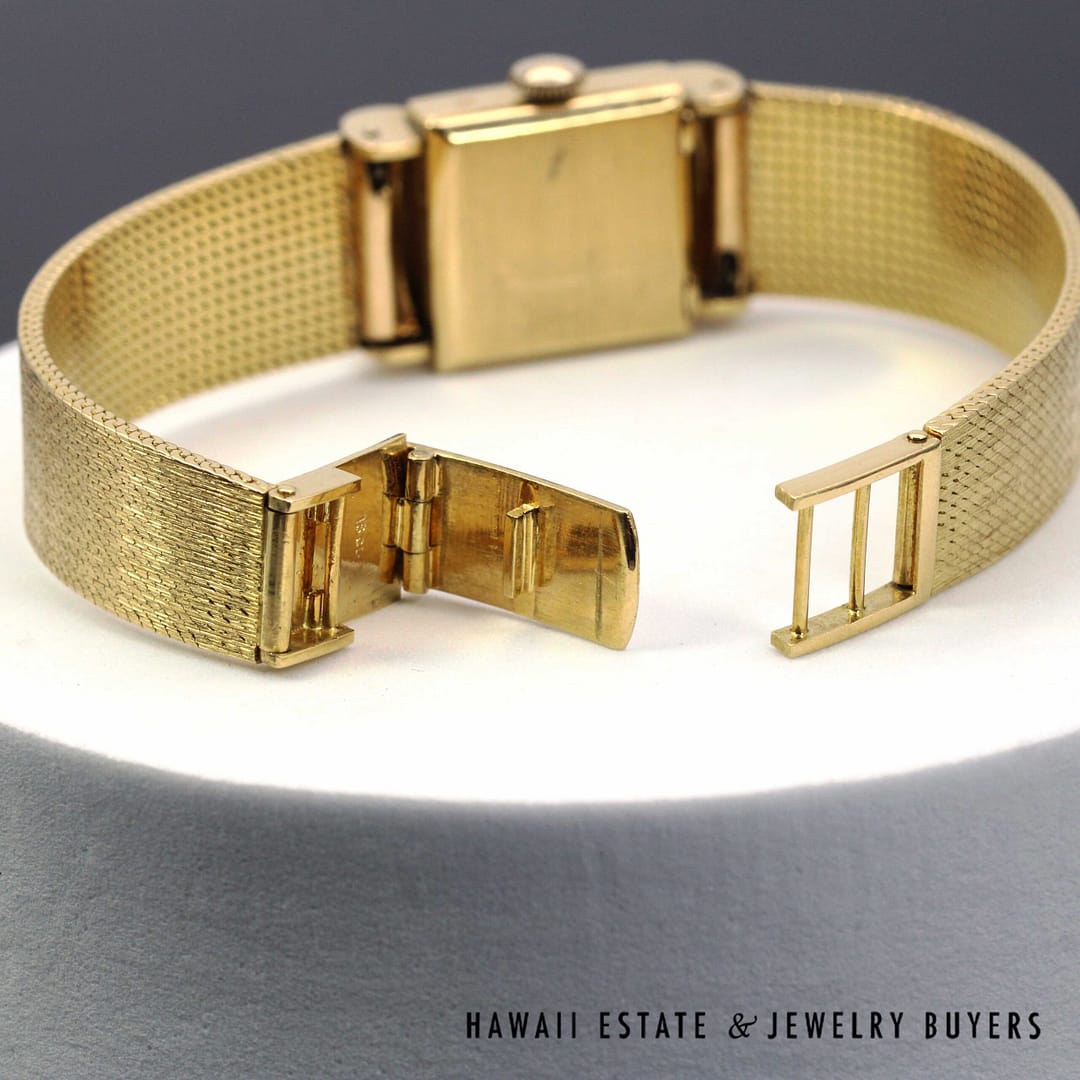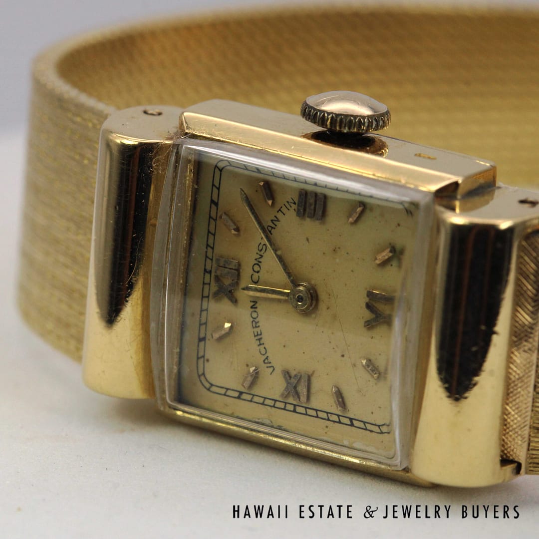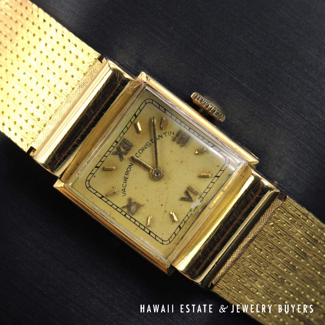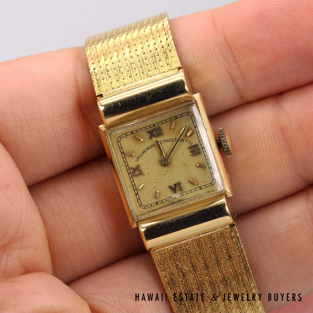 DescriptionVintage Vacheron Constantin 18K yellow gold square ladies wristwatch with original textures gold bracelet and classic dial. 49.9g VACHERON CONSTANTIN VINTAGE WRISTWATCH 18KYG 17mm SIZE 6.25SOLD AS IS.$5,600.001 in stockVintage Vacheron Constantin Square 18K Yellow Gold Ladies Watch 17mm Size 6.25 quantityAdd to cartBuy withMake OfferSKU: 060424-04Category: Pre-owned Luxury WatchesRelated StylesVINTAGE AUDEMARS PIGUET GENEVE 18K YELLOW GOLD AUTOMATIC GENTS STRAP WATCH$7,500.00BLVGARI WATCH WITH HANDWRITTEN LETTER BY DORIS DUKE to LON BENTLEY W/ ENGRAVING$11,000.00ANTIQUE HUNTER’S CASE ELGIN 14K YELLOW GOLD POCKET WATCH W/ PAPER APPRAISAL$4,000.00Rolex DateJust Salmon Mid Size Ladies$4,900.00