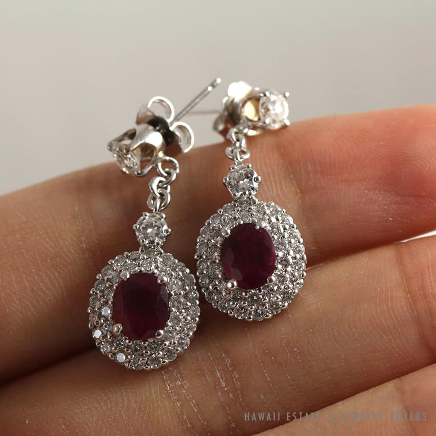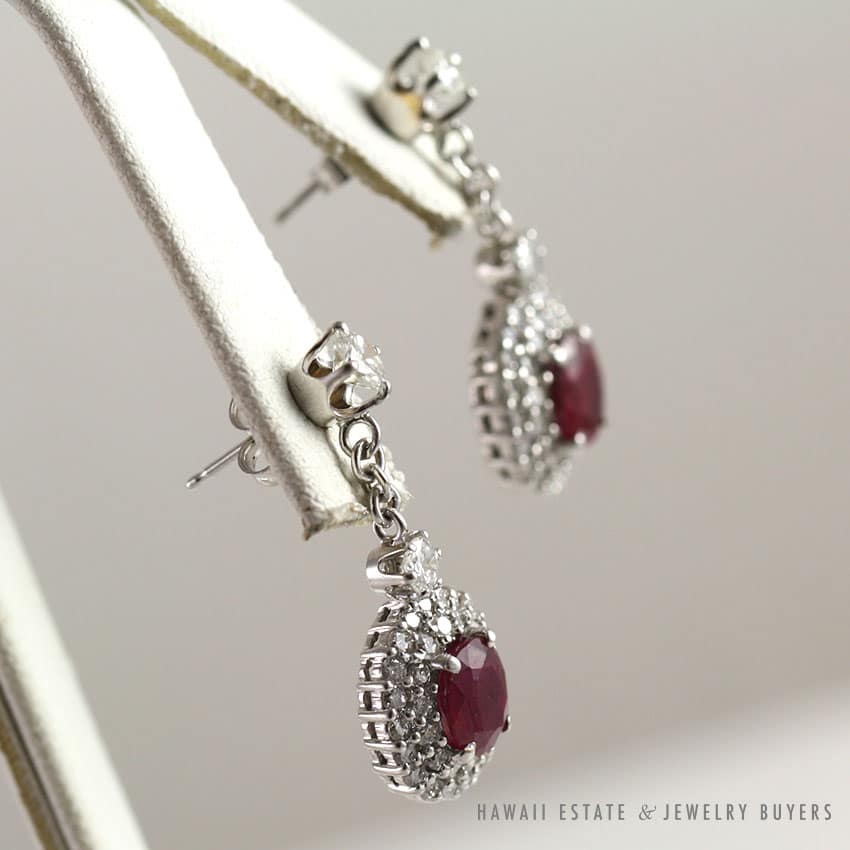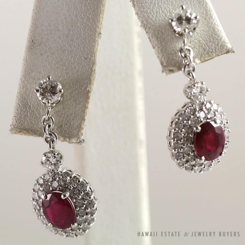 The earrings are set with four prong stud diamonds on top connected by a chain to two row pave’ oval settings with rubies four prong set in the center.